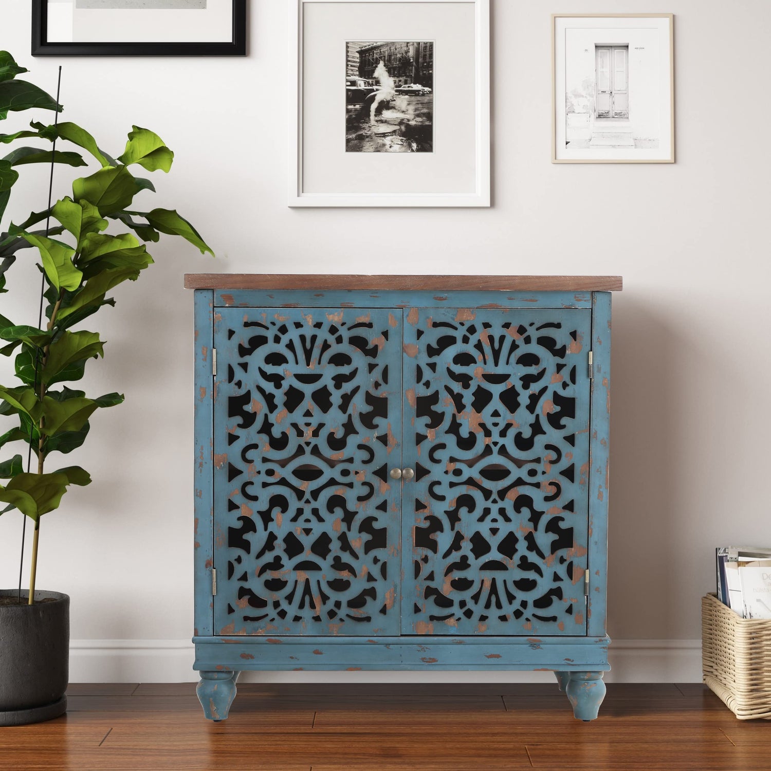 Sophia & William Accent Cabinet with 2 Doors, Distressed Storage Cabinet with Wood Frame and Hollow-Carved Door for Entryway Living Room, Blue