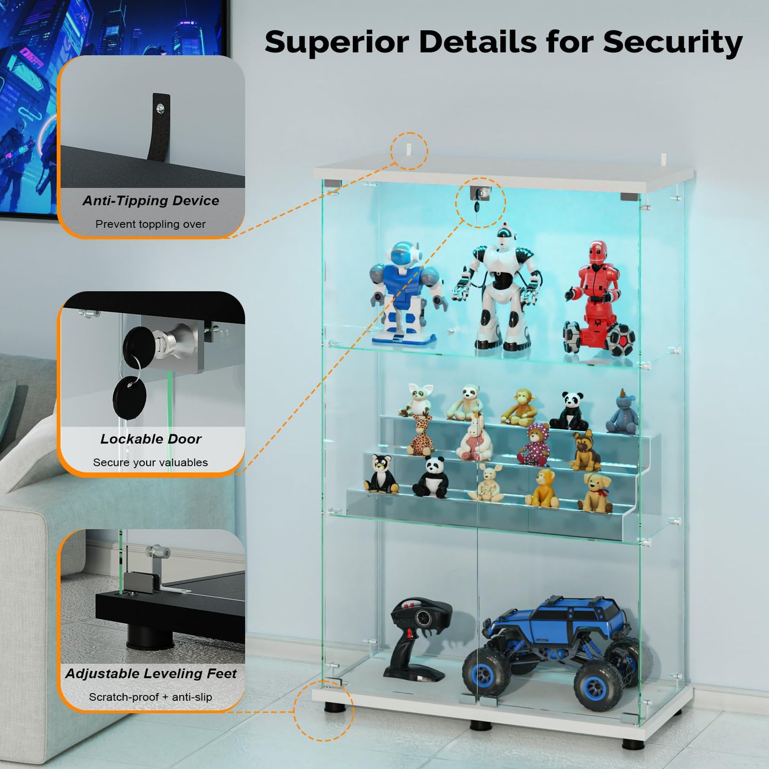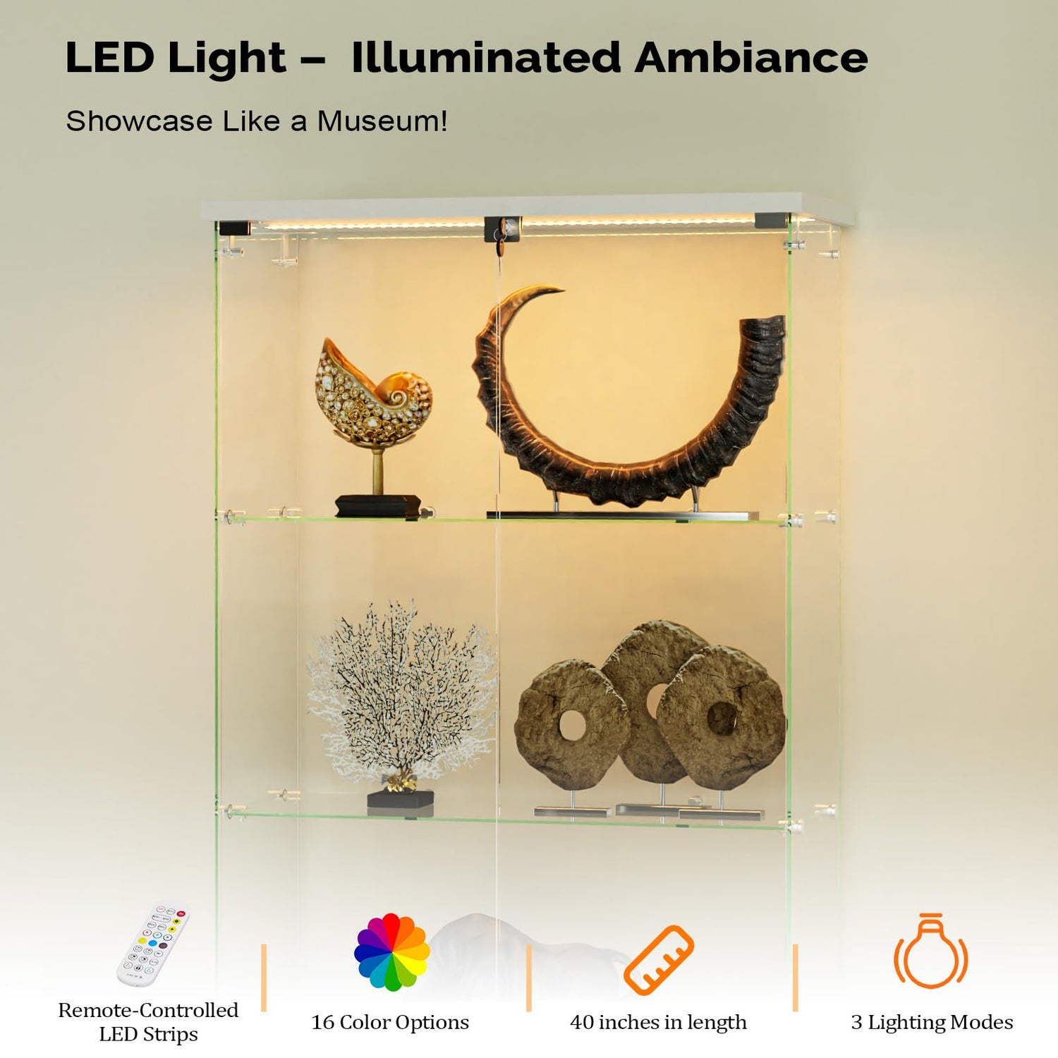 - 【LED - Illuminated Ambiance】The VINGLI Display Cabinet is equipped with an LED light strip that can be remotely controlled. You can choose from a variety of colors to create the perfect atmosphere for showcasing your collectibles, making each item stand out even more.