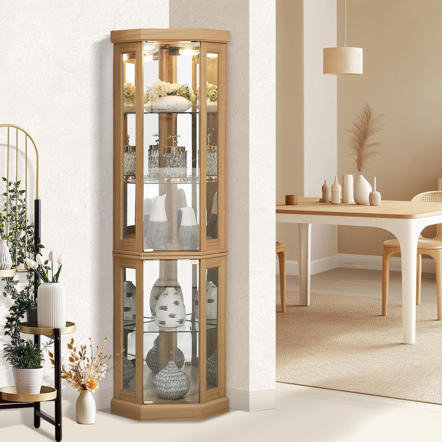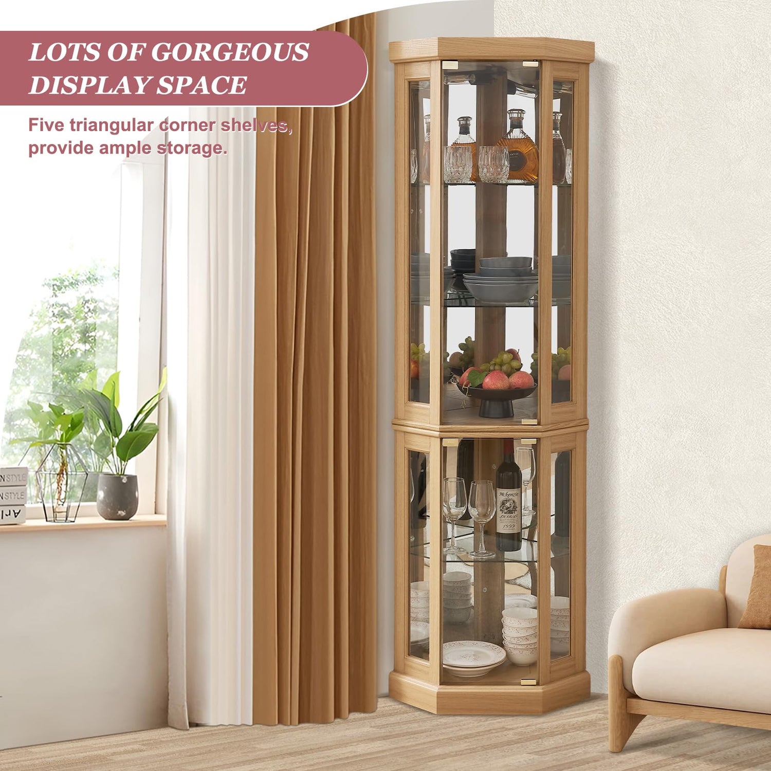 XUWANSHANG Corner Curio Cabinets,Lighted 3-Side Glass Display Curio Cabinet, Curved Wood Corner Cabinet,Curio Cabinets with Glass Doors,Adjustable Shelves,Curio Cabinet for Living Room,Light Oak