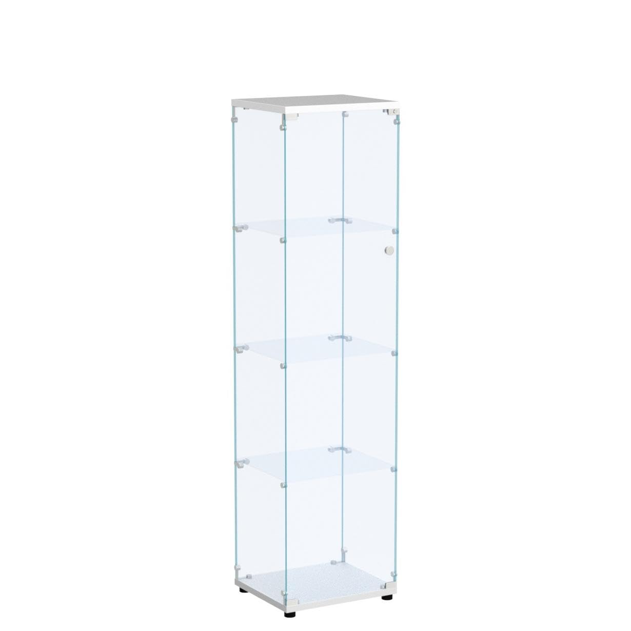 The cabinet boasts a versatile four-shelf design that is both sturdy and stylish, perfect for displaying a variety of items. Whether you want to showcase photos, books, action figures, wine, or whisky, this glass display cabinet caters to all. The glass door opens and closes effortlessly, while bumper strips between the glass plates and sides provide maximum safety, ensuring that your display remains secure.