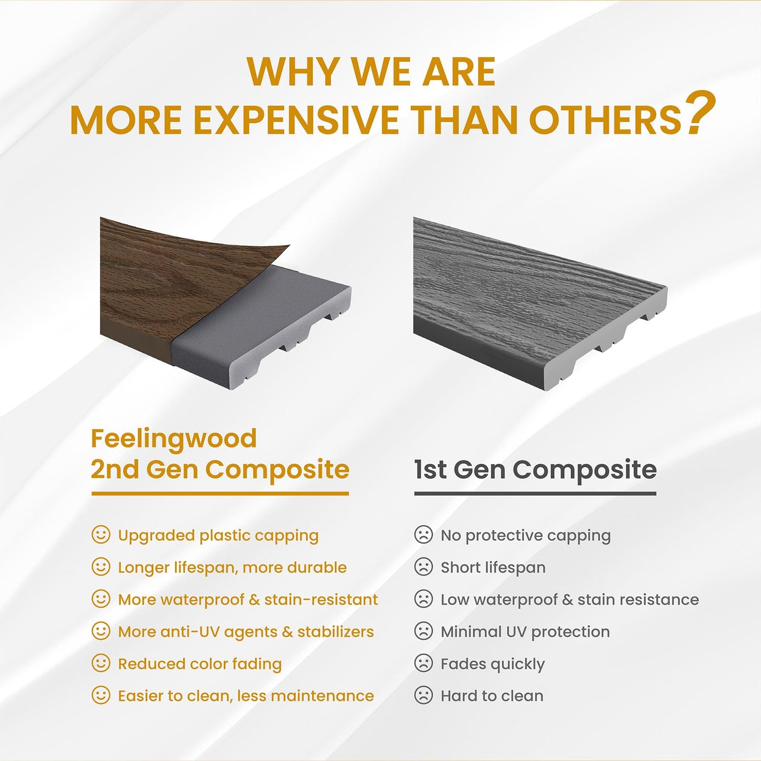- Durable & High Performance: Made from premium wood fibers and HDPE, and coated with an enhanced polymer layer, Feilingwood composite deck tiles offer superior resistance to water, fading, rot, mold, wear, and cracking, ensuring lasting durability in any outdoor settings. 1 box of 20 pieces covers about 19.4 sqaure feet.