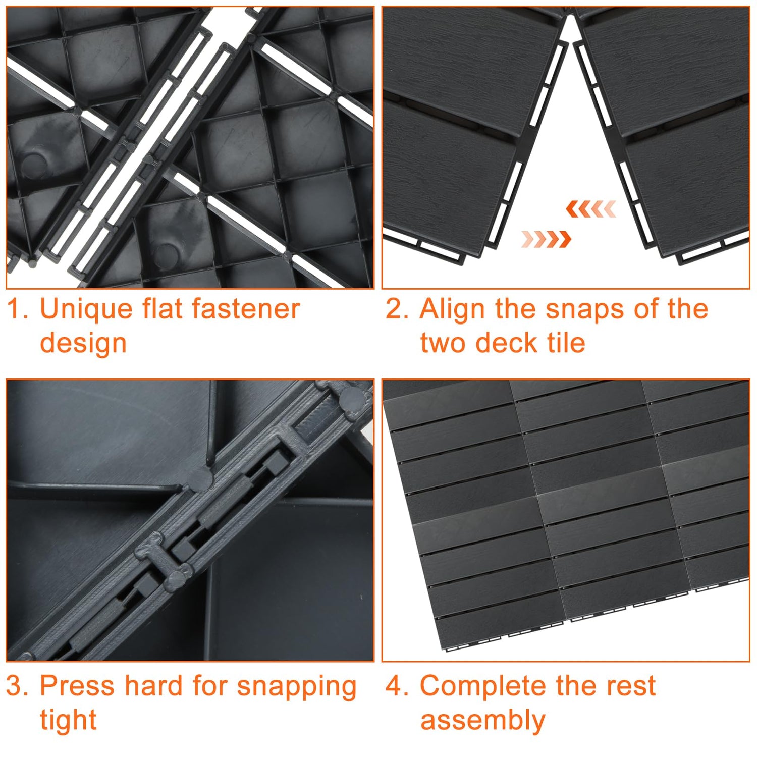 Details: SHUESS 9 PCS Interlocking Deck Tiles 12”x 12” Patio Deck Tiles Plastic Waterproof Outdoor Flooring Covering for Walkway Front Porch Poolside Balcony Backyard, Black ( All Weather Use)