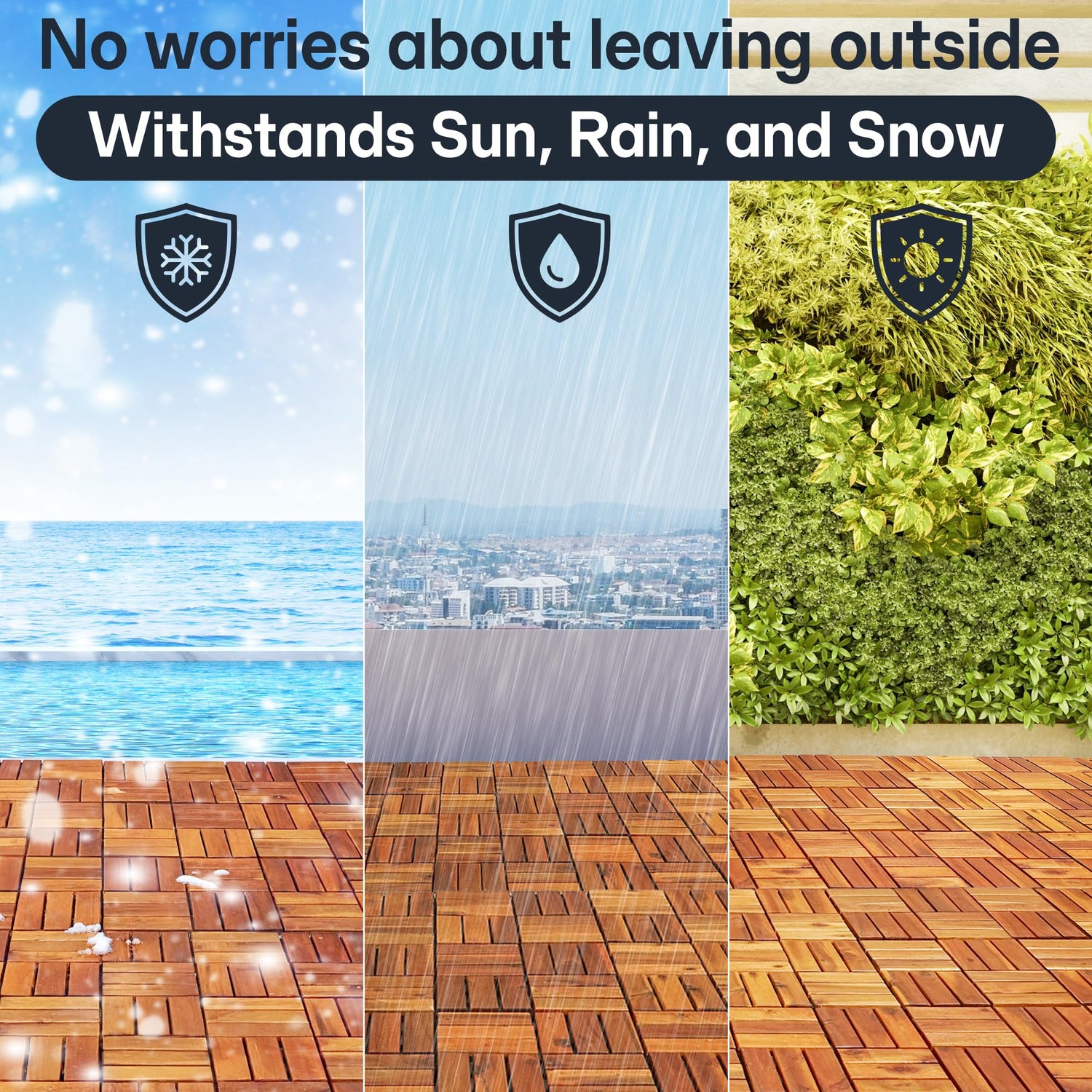 - PREMIUM ACACIA WOOD CONSTRUCTION – Crafted from durable, sustainable solid acacia wood and reinforced with high-quality plastic base, these interlocking deck tiles withstand rain, sun, wind, and heavy outdoor use without cracking or deforming.