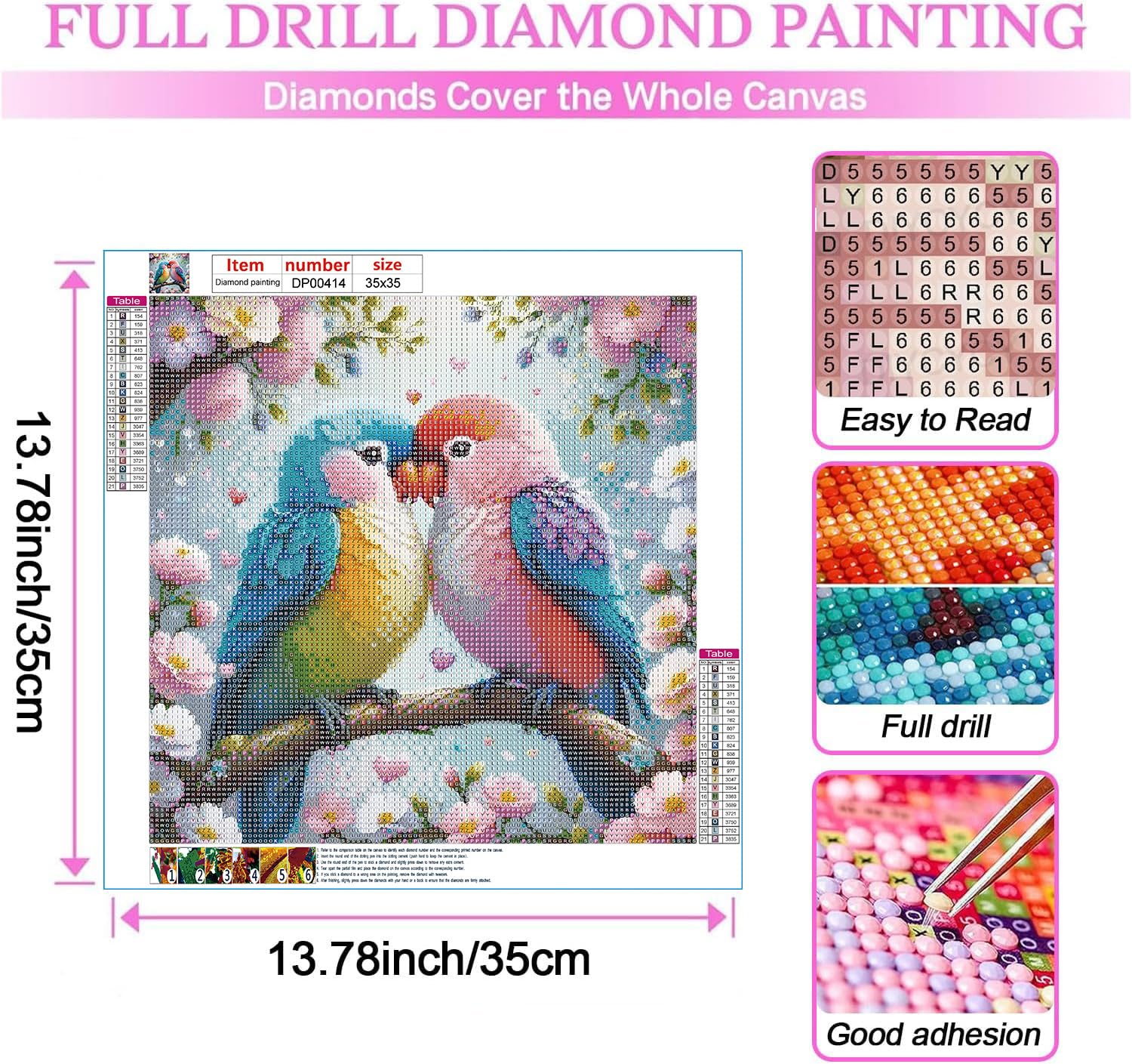 - High Quality Canvas:Diamond Art Painting Kits uses HD printed waterproof canvas, letter symbols are clear and easy to understand, the pattern itself has a sticky background, and the diamond stays very well