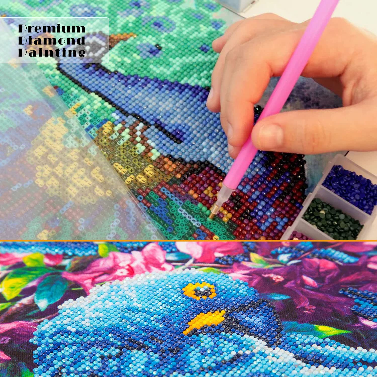 • Premium Diamond Painting Kits: Pictures clear (numbers and letters are clearly visible), colors are vibrant, canvas is high quality, easy and fun to use, comes with all necessary parts, including spare gems