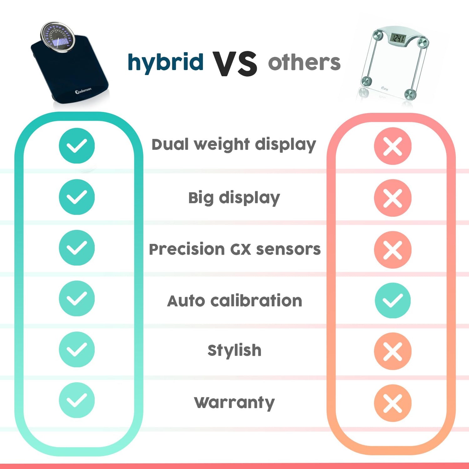 - ๐ DUAL WEIGHT MEASUREMENT DISPLAY: Introducing the Adamson Hybrid Bathroom Scale โ the only choice of digital scales for body weight. Our innovative scale provides both digit and analog dial weight measurements, giving you the best of both worlds - digital accuracy with an analog scale experience.