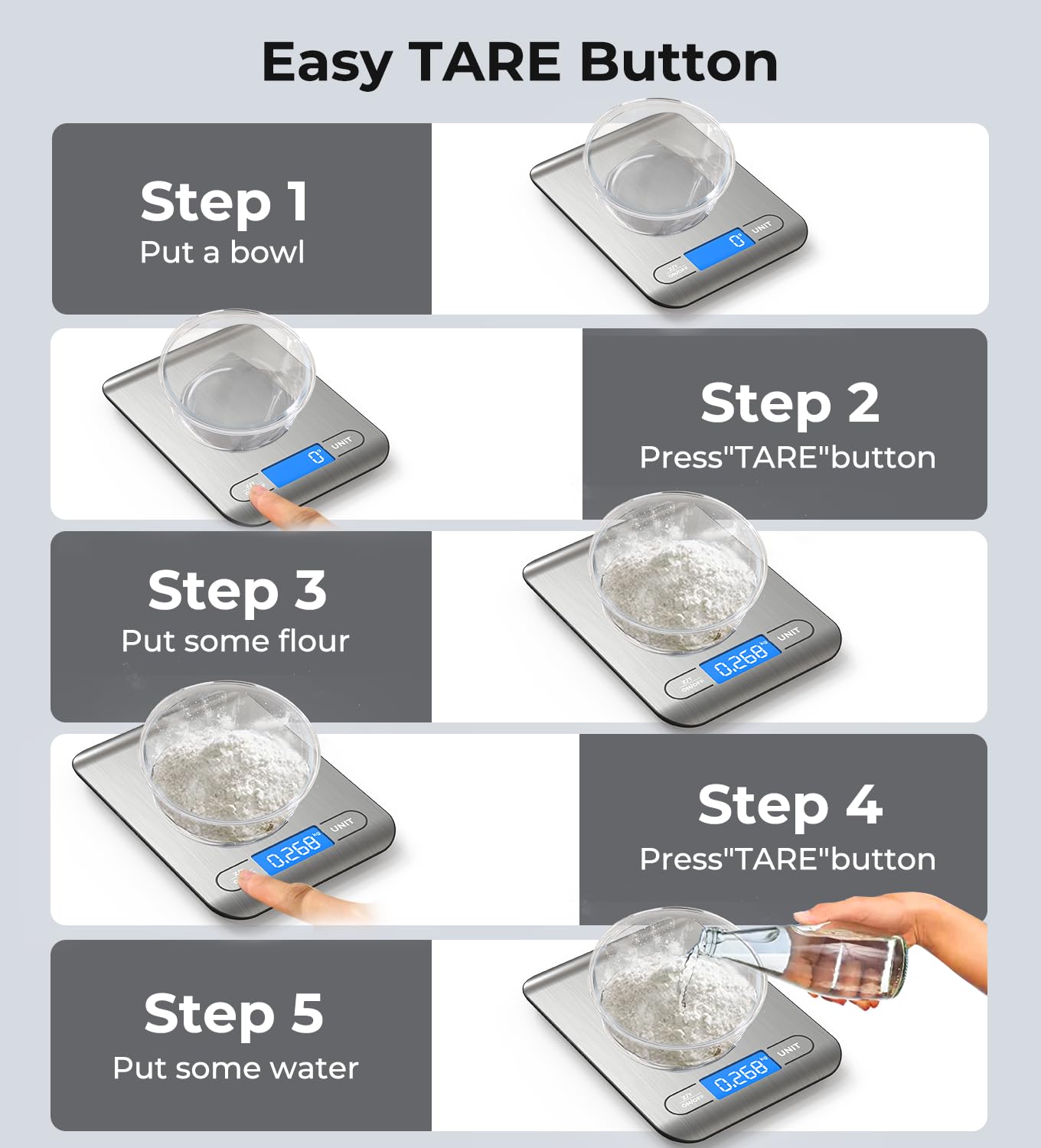 - ๐ ๐๐ง๐ข๐ญ๐ฌ ๐๐ง๐ ๐๐๐ซ๐ ๐ ๐ฎ๐๐ญ๐ข๐จ๐ง : Simply press the Unit button to toggle between the five units: g, kg, lb, fl'oz, and ml.By pressing the Tare button, you can easily perform a zeroing operation.