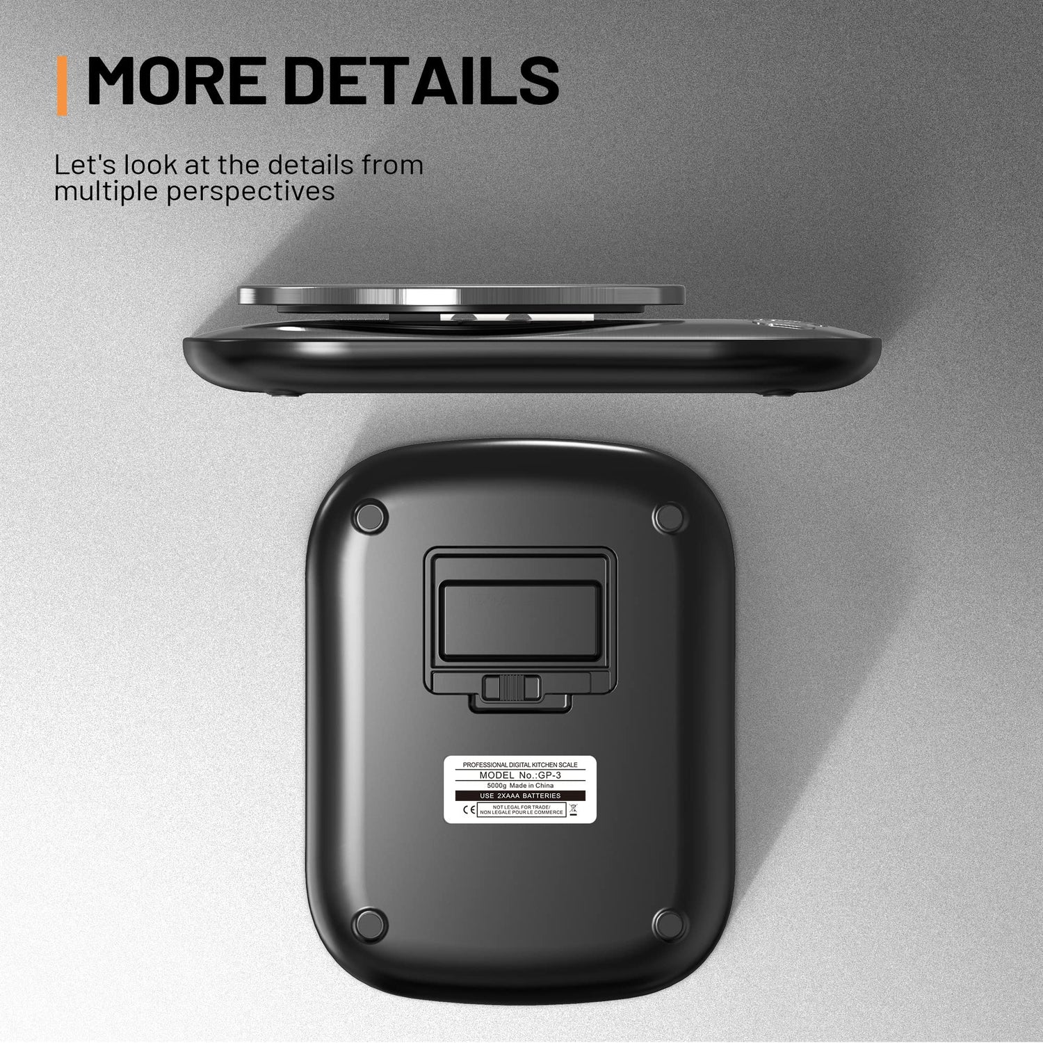 • d)【FASHION & STRONG】Made from stainless steel for long term use, with a mixing bowl (2.6QT/2.5L) for easy mixing and pouring, and a modern and stylish design with a quadrilateral stainless steel scale panel, brushed and with rounded edges, with a stainless steel round scale pan for a strong three-dimensional feel and high class aesthetics. The scales are thin, with an ABS wrapped edge and tightly bonded edges, and the battery compartment has a waterproof strip and is IPX6 rated.