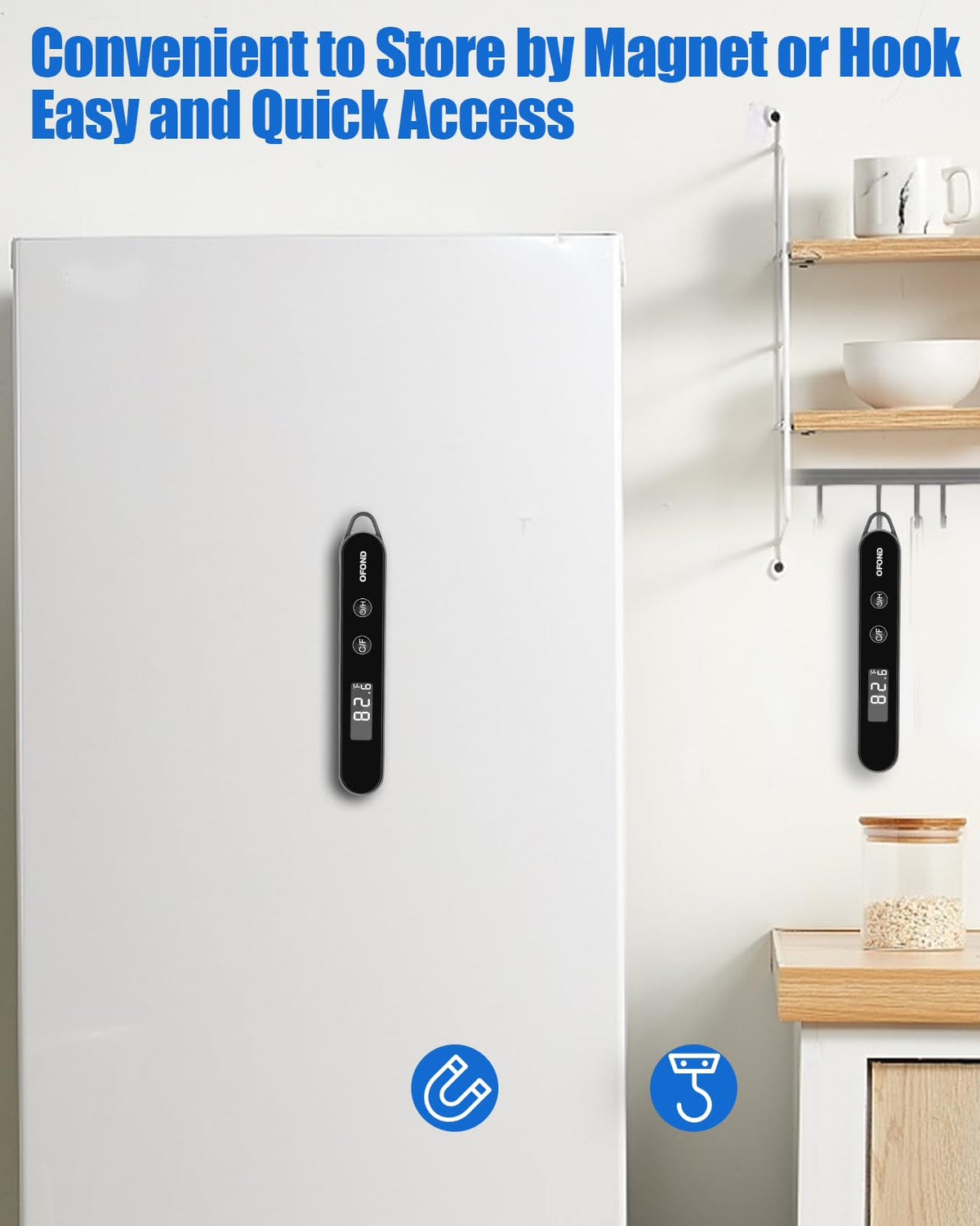 - Magnetic & Hang: OFOND digital cooking thermometer with a magnetic suction on the back and a hanging hole on the top, meat thermometer can be attached to the refrigerator, oven, or hanging stored. The long handle design is easy to grip, hands no need to be too close to the heat source when measuring temperature.