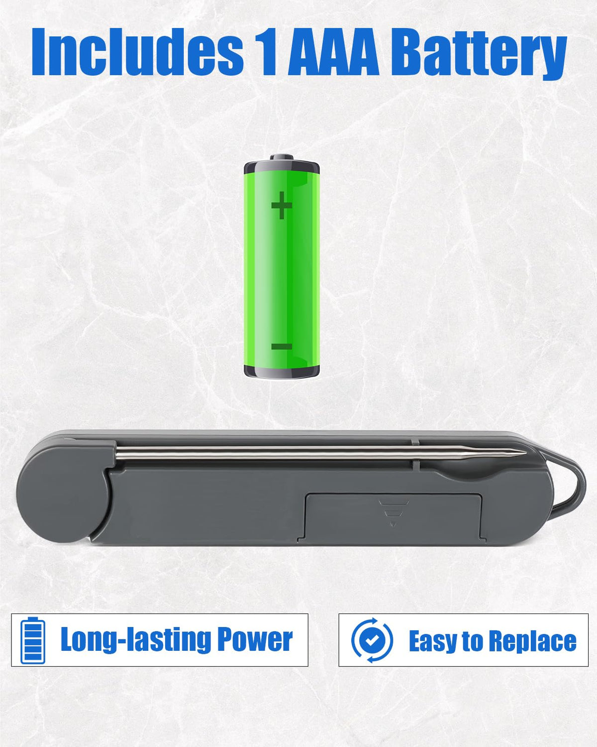 - 1 AAA Battery Included: Long-lasting power, no need to frequently charge or replace the battery. The battery compartment open easily without tools. The digital meat thermometer also is easy to clean, simply wipe with a soap cloth to achieve a cleansing effect. Do not soak the thermometer directly in water or put it in the dishwasher for cleaning.