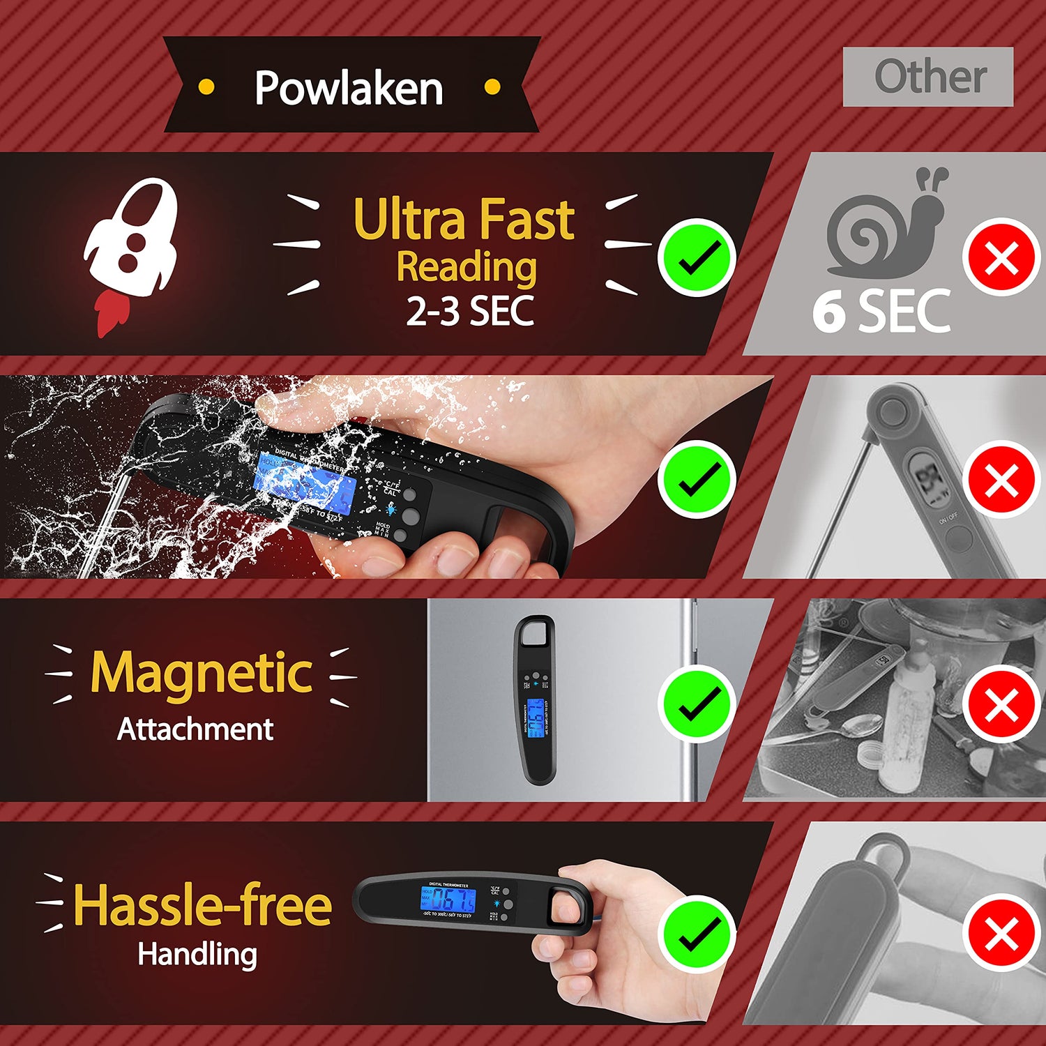 POWLAKENXS Instant Read Meat Thermometer for Kitchen Cooking, Ultra Fast Precise Waterproof Digital Food Thermometer with Backlight, Magnet and Foldable Probe for Deep Fry, Outdoor BBQ, Grill (Black)