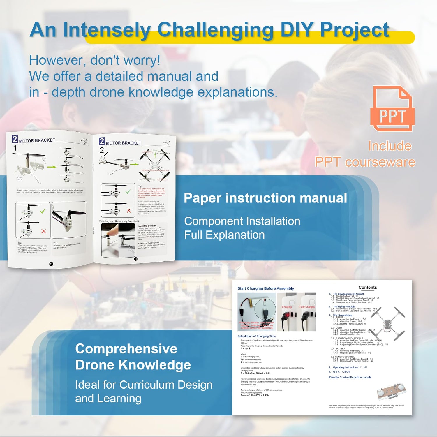 Assembly Adventure High-Power Coreless Motors: This DIY drone kit is equipped with high-performance coreless motors, promising a thrilling flight experience. Hands-On Process: From the first screw to the final assembly, you'll be fully immersed in the hands-on building process. Time & Skill: The entire assembly takes approximately 1.5 hours and requires a certain level of practical skills and patience. Age Recommendation: Suitable for users aged 14 and above. Difficulty Level: 5 out of 5, making it a challenging yet rewarding project. A Project to Showcase Wealth of Knowledge: Packed with drone knowledge, this kit allows you to gain a deeper understanding of drone-related concepts as you assemble it. Impress Others: Not only will your finished drone turn heads, but the in-depth knowledge you've acquired will also leave others in awe. Versatile Flight Features Five Amazing Features: Enjoy 360° flips, one-key takeoff and landing, headless mode, and speed adjustment for endless flight fun. Thrilling Performances: Put on thrilling flight performances right in your office or at home, adding excitement to your everyday life. Operation Difficulty: Note that the operation difficulty is 5 out of 5, requiring practice to master the flying skills. Worry-Free Flying Experience Spare Propellers: The kit comes with spare propellers, ensuring you can quickly replace them and continue flying even if you encounter unexpected issues. Long Flight Time: Each charge provides up to 7 minutes of continuous flight time, allowing you to enjoy extended flying sessions. Educational Value Detailed Instruction Manual: The comprehensive manual not only explains the basic principles of drones but also serves as an excellent reference for STEM project plans or course designs. Editable PPT Courseware: We also offer editable PPT courseware to support your educational endeavors, making it a great tool for teachers and students alike. Important Note Highly Challenging: This is a highly challenging DIY project that requires manual assembly of the drone body and motors. Choose Wisely: If you're easily distracted or lack problem-solving abilities, please choose carefully. Comprehensive Support: Rest assured, we provide comprehensive technical support to assist you throughout the process. Success Guaranteed: With patience and careful reference to the instruction manual, most users can successfully experience all the fun features this drone has to offer.