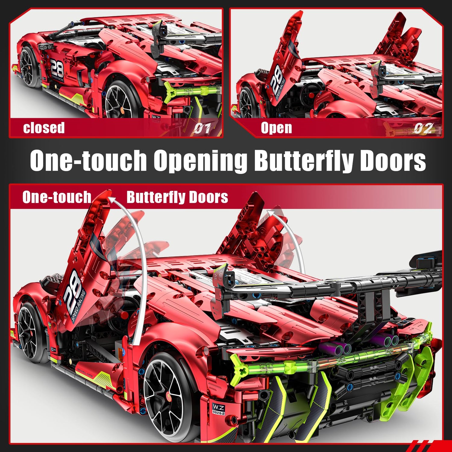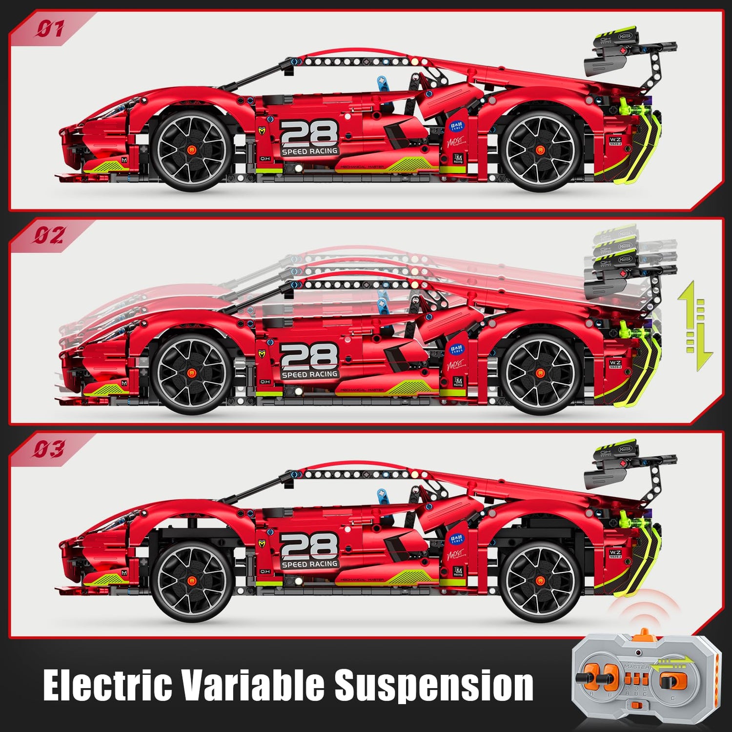 - Electric Suspension System: The Electric Suspension System allows you to lift and lower the chassis using the remote control, making it adaptable to different terrains. Plus, the one-touch opening butterfly door adds to the real details of the racing car.
