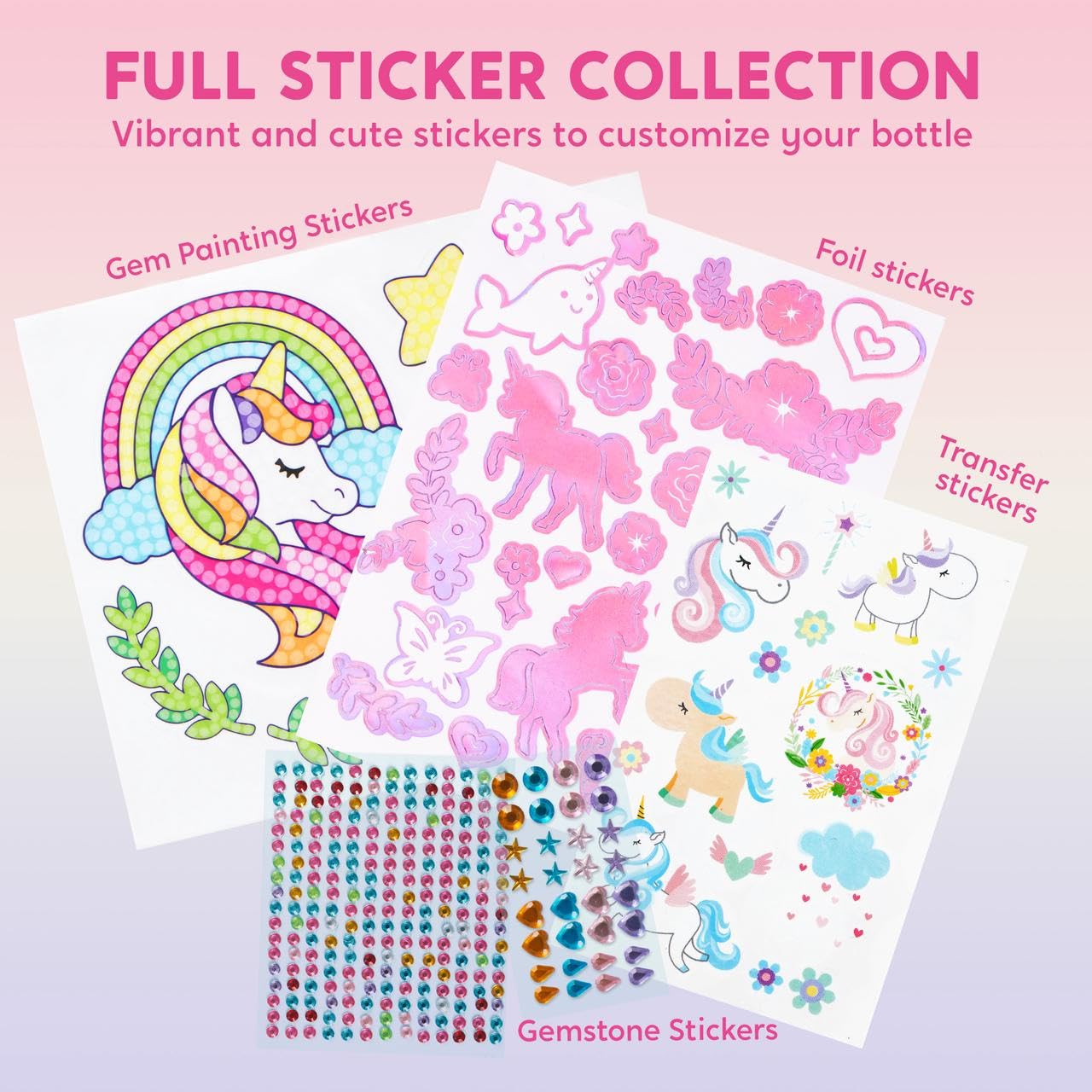 - Full Stickers Collection: Our kit includes a wide variety of stickers, such as foil stickers, gem stickers, transfer stickers, and unicorn theme gem painting stickers. With this extensive collection, kids can mix and match to craft countless unique designs on their water bottles, making each one truly one-of-a-kind.