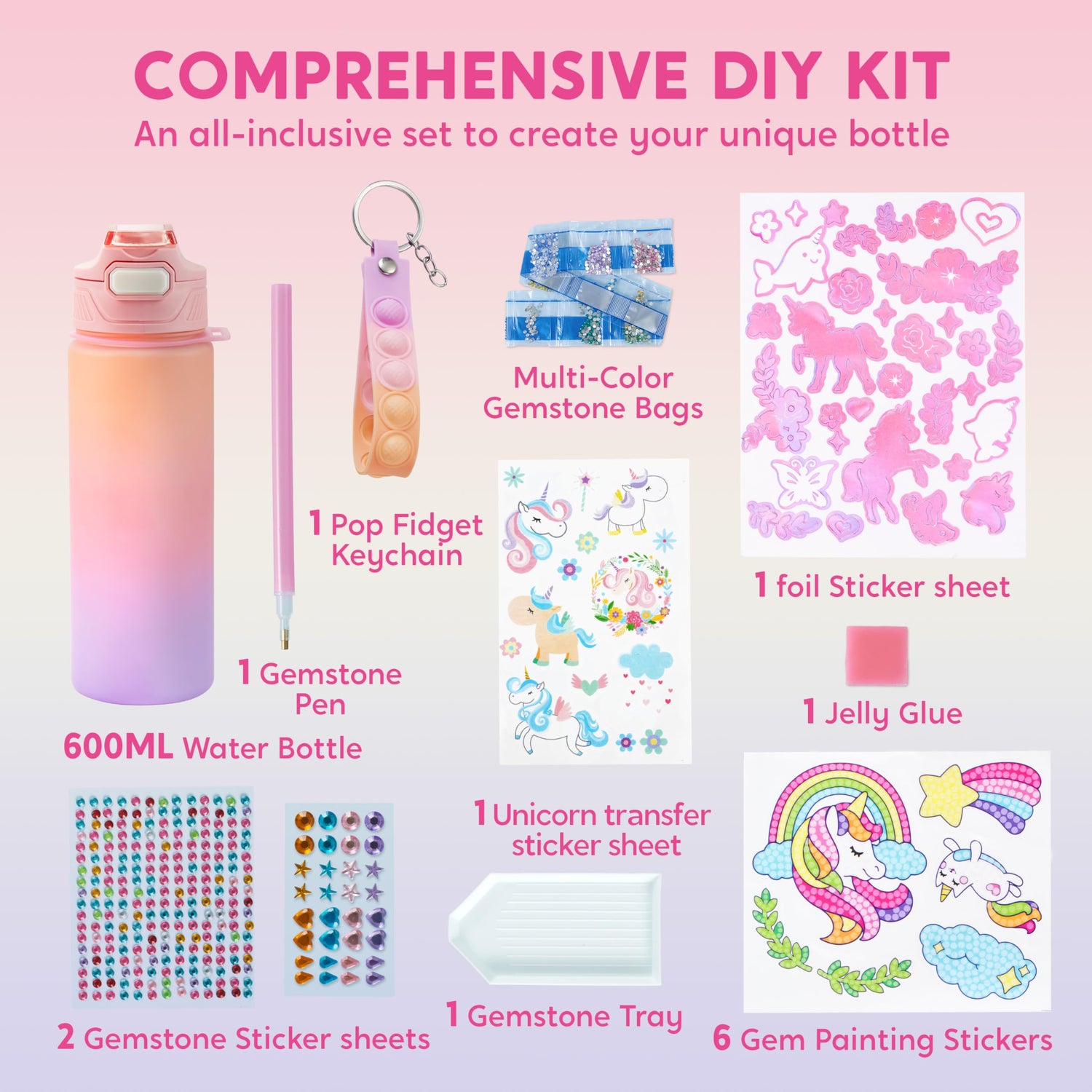 - Decorate Your Own Water Bottle Kits: Our DIY Water Bottle Kit includes a 600ml gradient color bottle with a straw lid, a pop fidget keychain, foil stickers, unicorn theme gem painting stickers, transfer stickers, and gem stickers. Kids can unleash their creativity and decorate their very own water bottle, providing hours of fun.