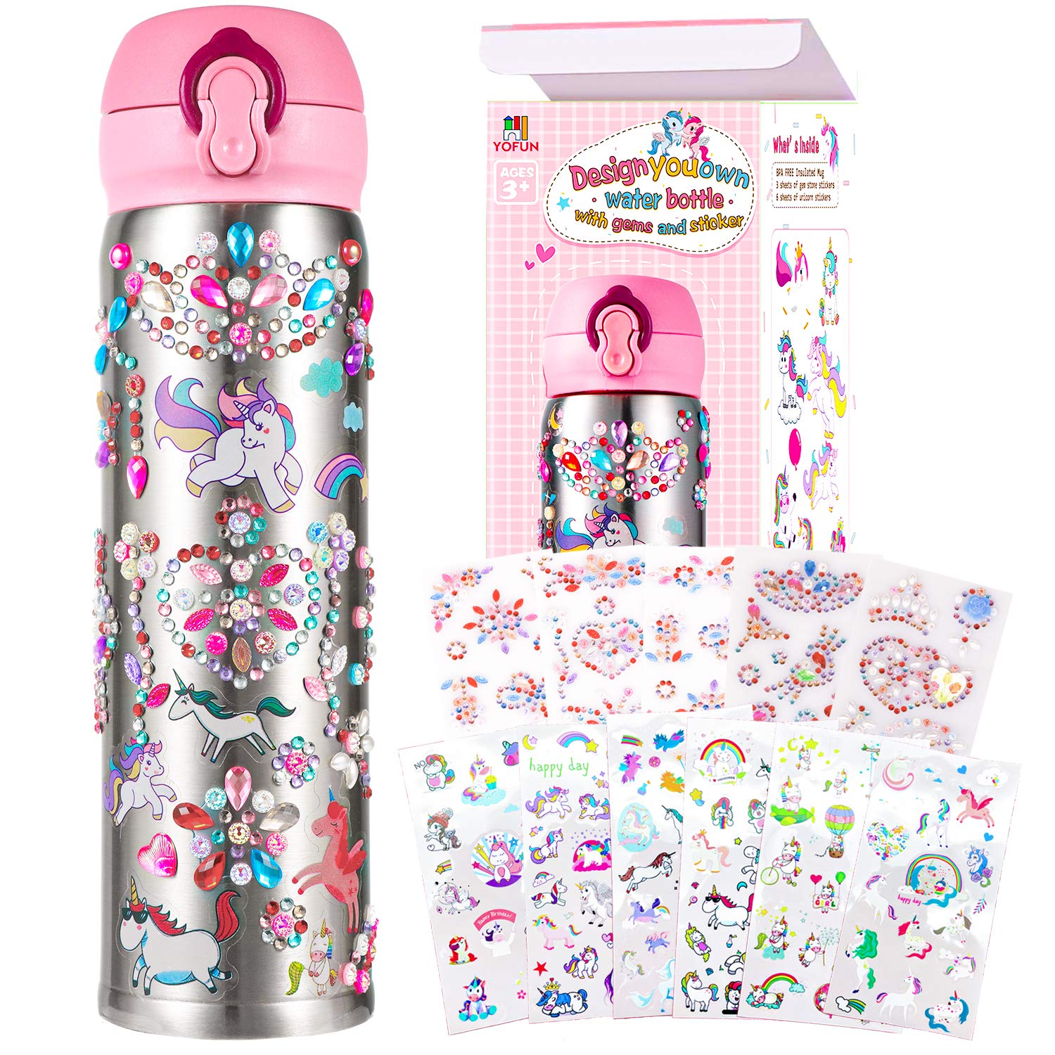 YOFUN Decorate Your Own Water Bottle with 11 Sheets of Unicorn Stickers & Glitter Gems, Craft Kit & Art Kit for Children, Gift for Girls Age 4 5 6 7 8 9 10 Years Old Kids, BPA Free Insulated (Silver)