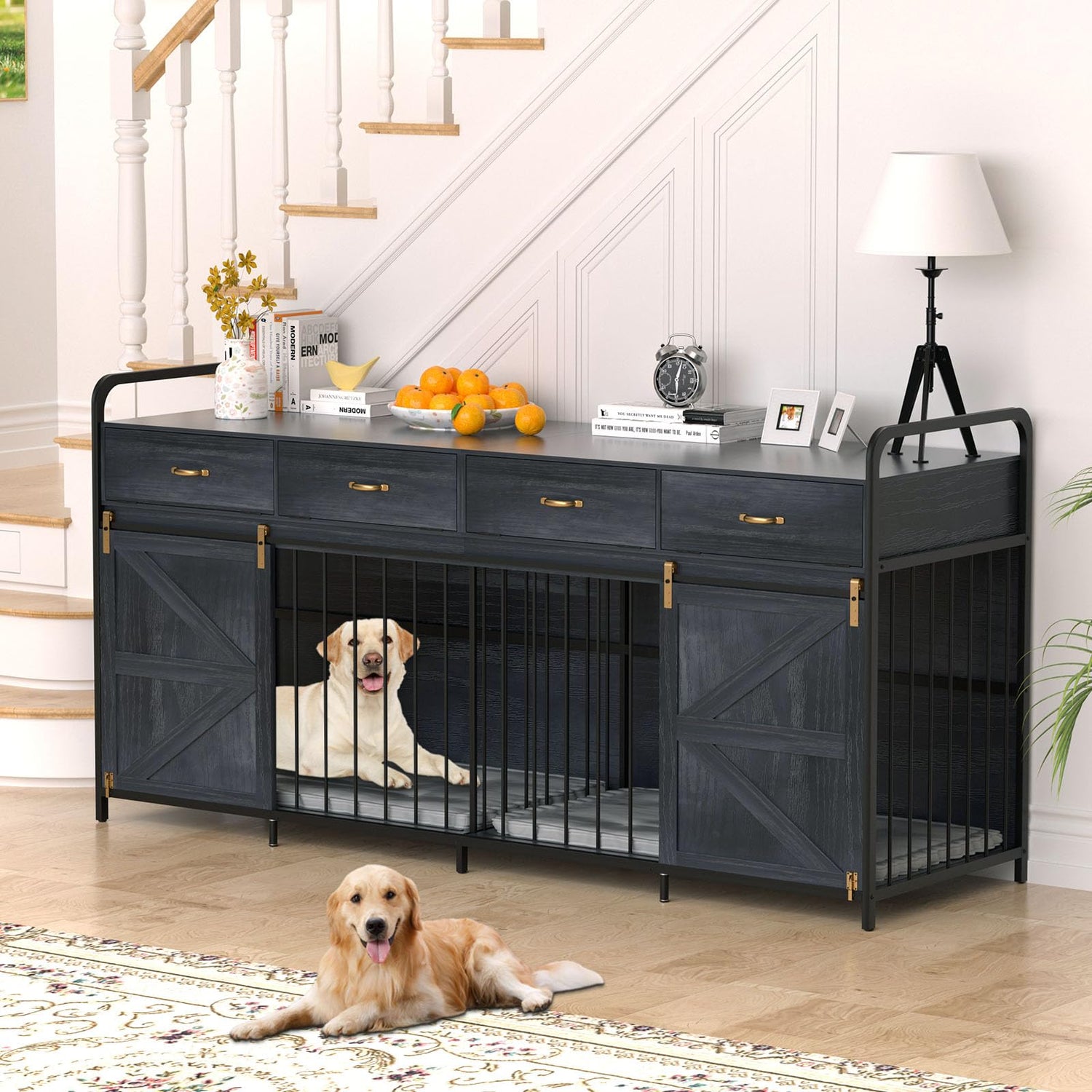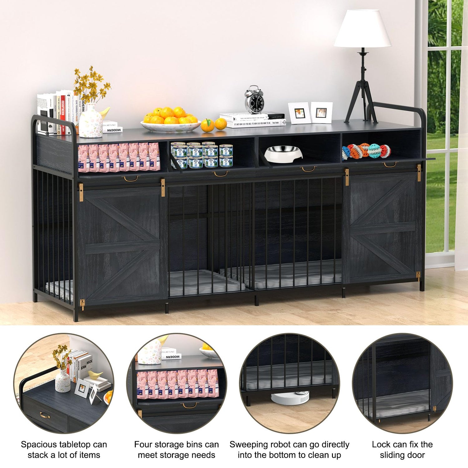 - Convenient Storage Space: Equipped with four independent storage compartments, it helps organize pet toys, food, and more, saving space and keeping your living area tidy; the sliding barn door design allows for easy access while saving space