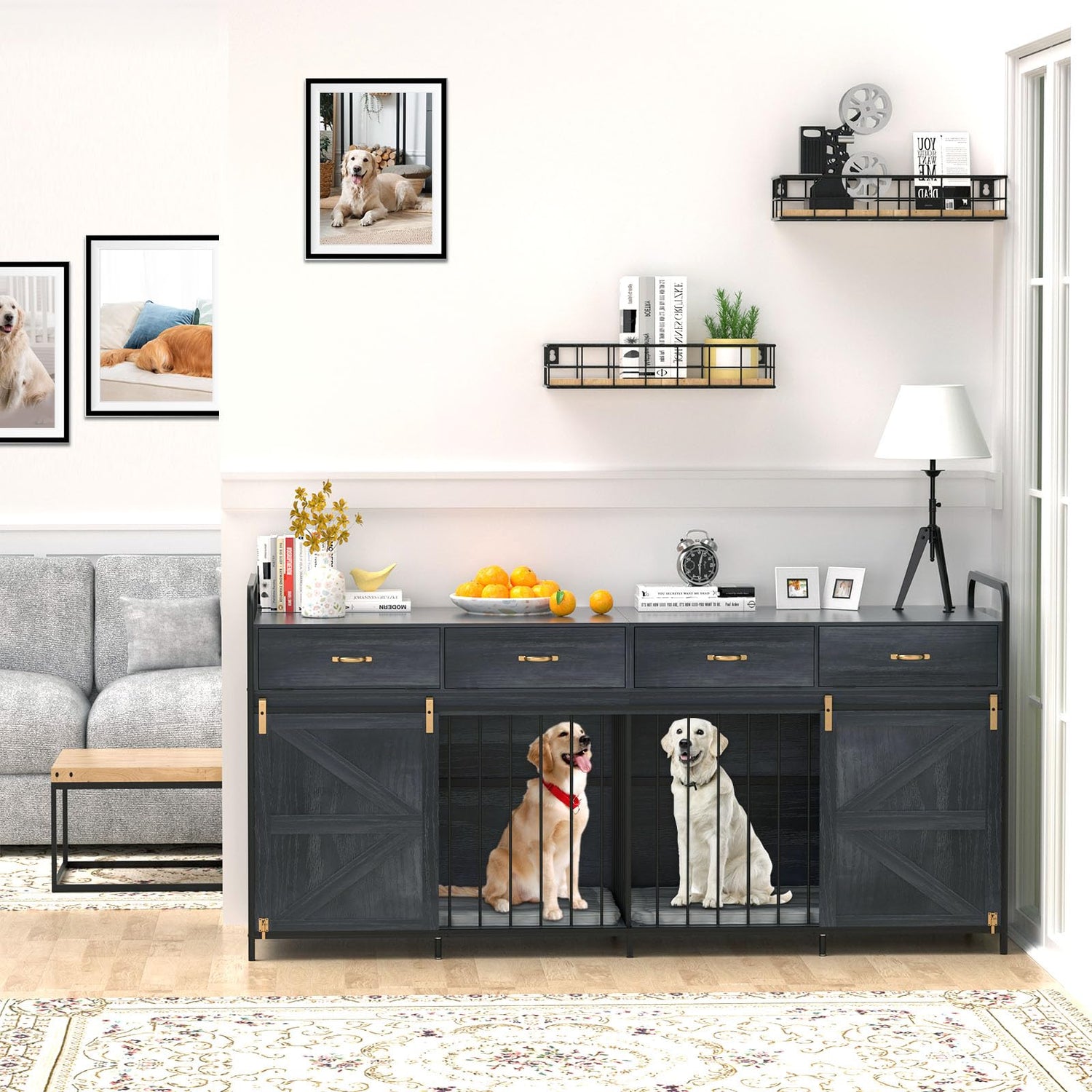 78.7 Inch Large Dog Crate Furniture for 2 Dogs Extra Large Dog Kennel Heavy Duty Wood Dog Crate Double Dog Crates Furniture TV Stand (Black)