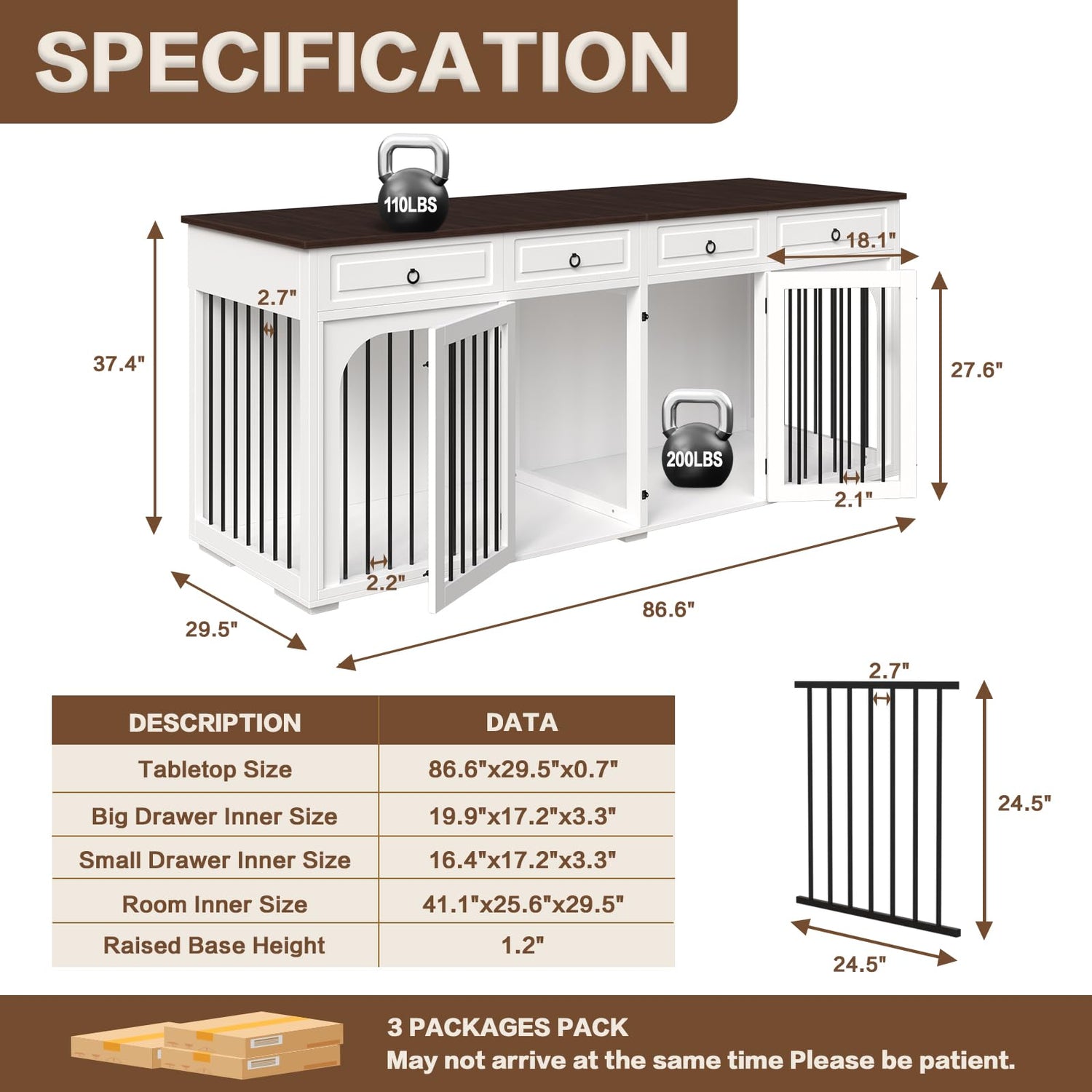 - 【LARGE TABLETOP & 4 DRAWERS】86.6"L x 29.5"W large desktop,the load can reach 150 pounds,modern dog crate furniture can holds 80 Inches TV,you can also place stereo and other decorative items.Equipped with 4 drawers organize more things, dog toys, dog leashes, snacks, etc,this dog kennel furniture has the perfect home decoration and storage function.