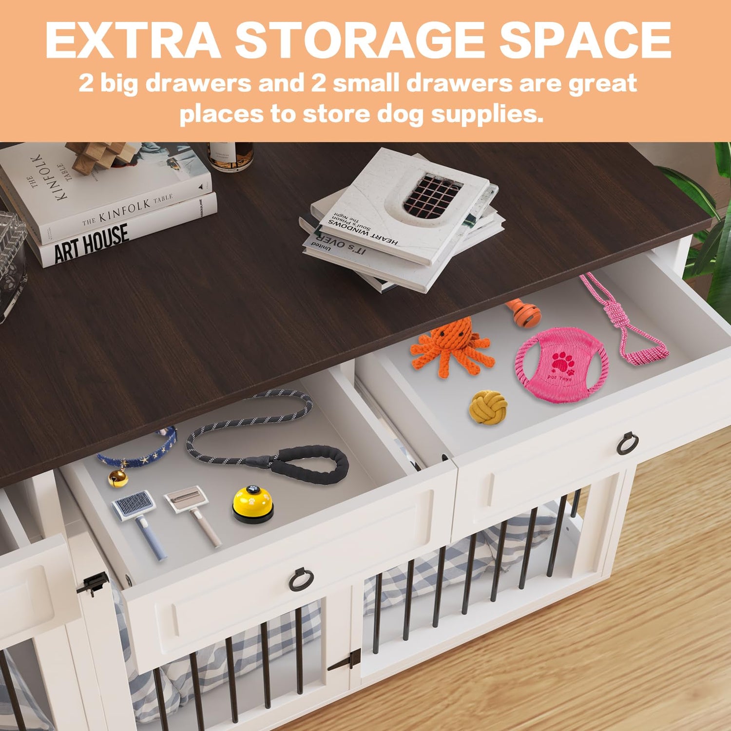 86.6" Double Dog Crate Furniture with 4 Drawers,Indoor Wooden Dog Kennel Furniture for 2 Large Breed Dogs with Divider,Heavy Duty Dog Crate Furniture TV Stand for Large Medium Dogs,White