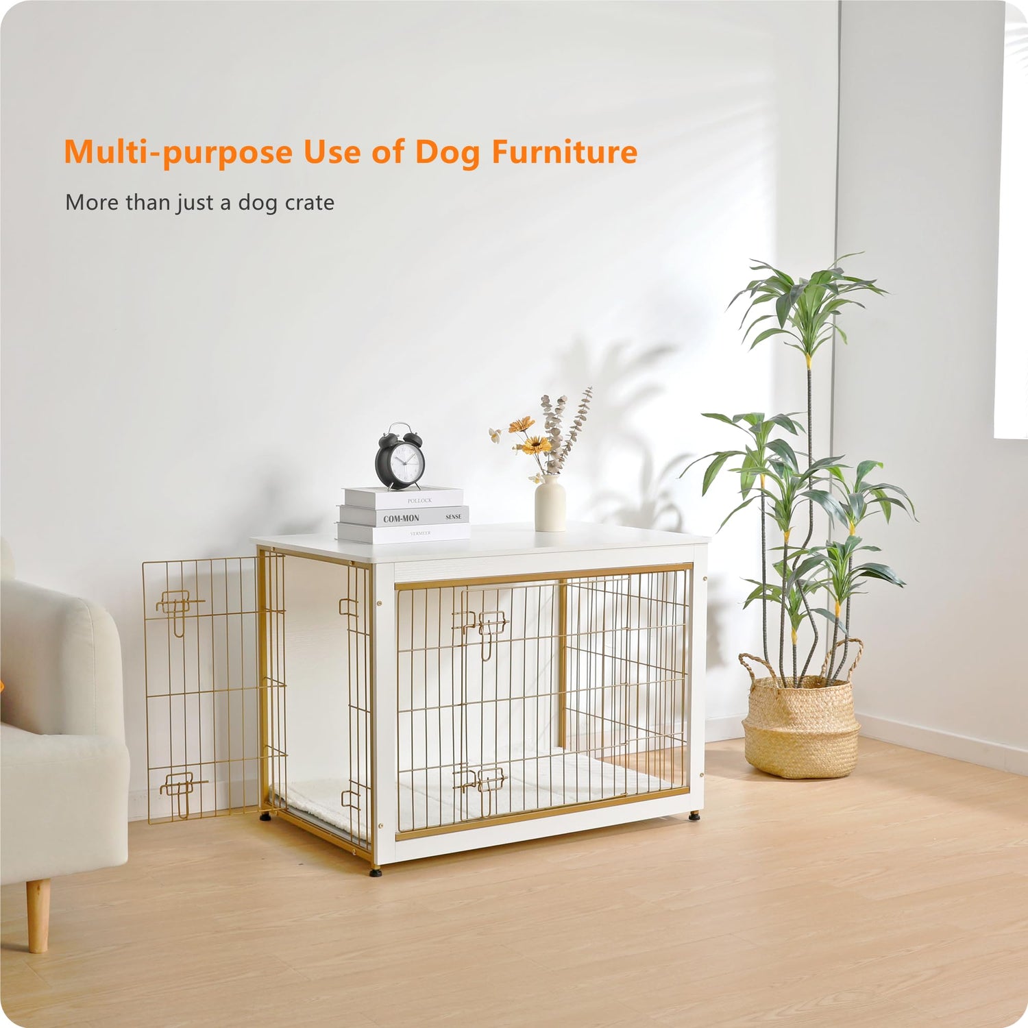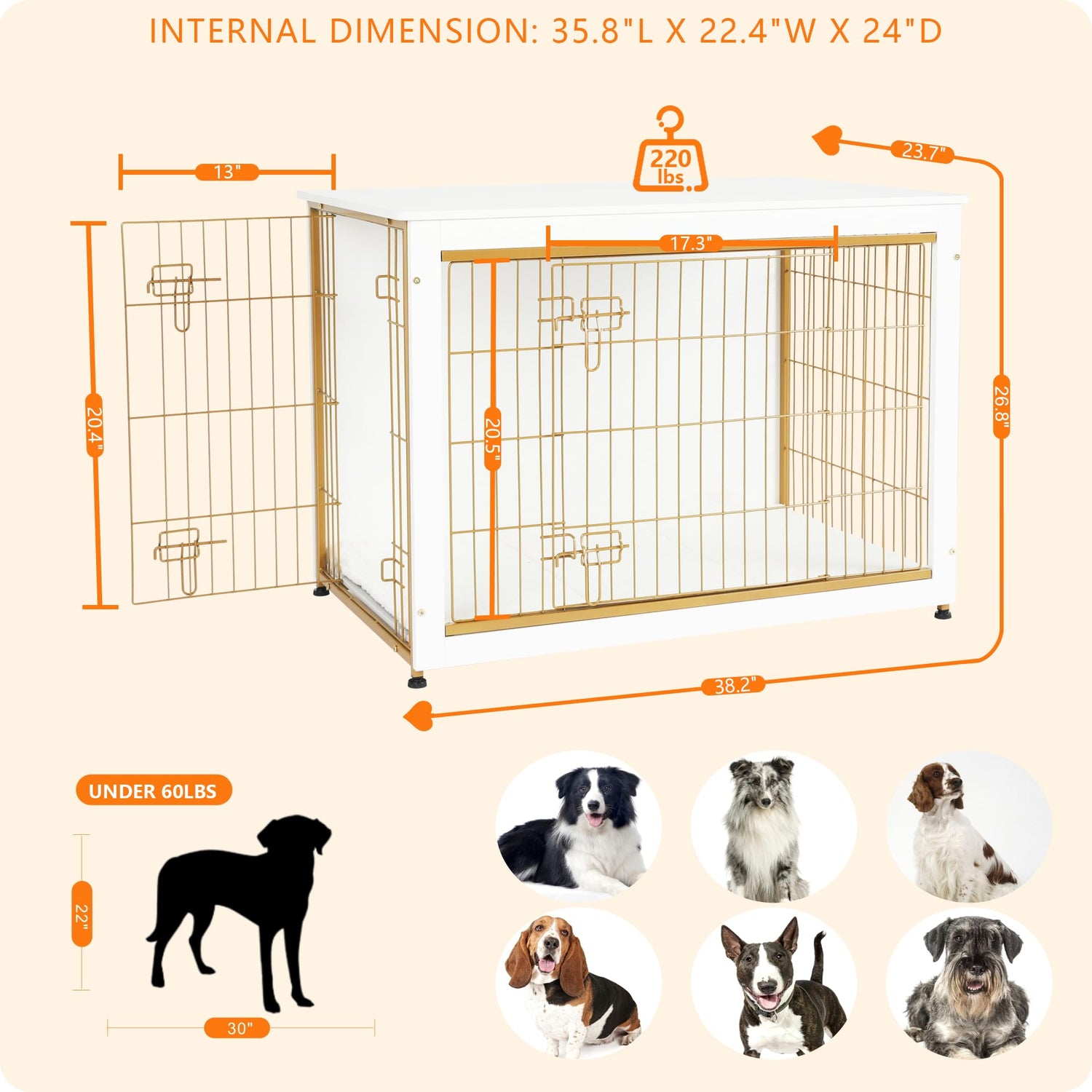 DWANTON Dog Crate Furniture with Cushion, Wooden Kennel Table with Double Doors, Indoor Dog House, Large Size, 38.5" L, White