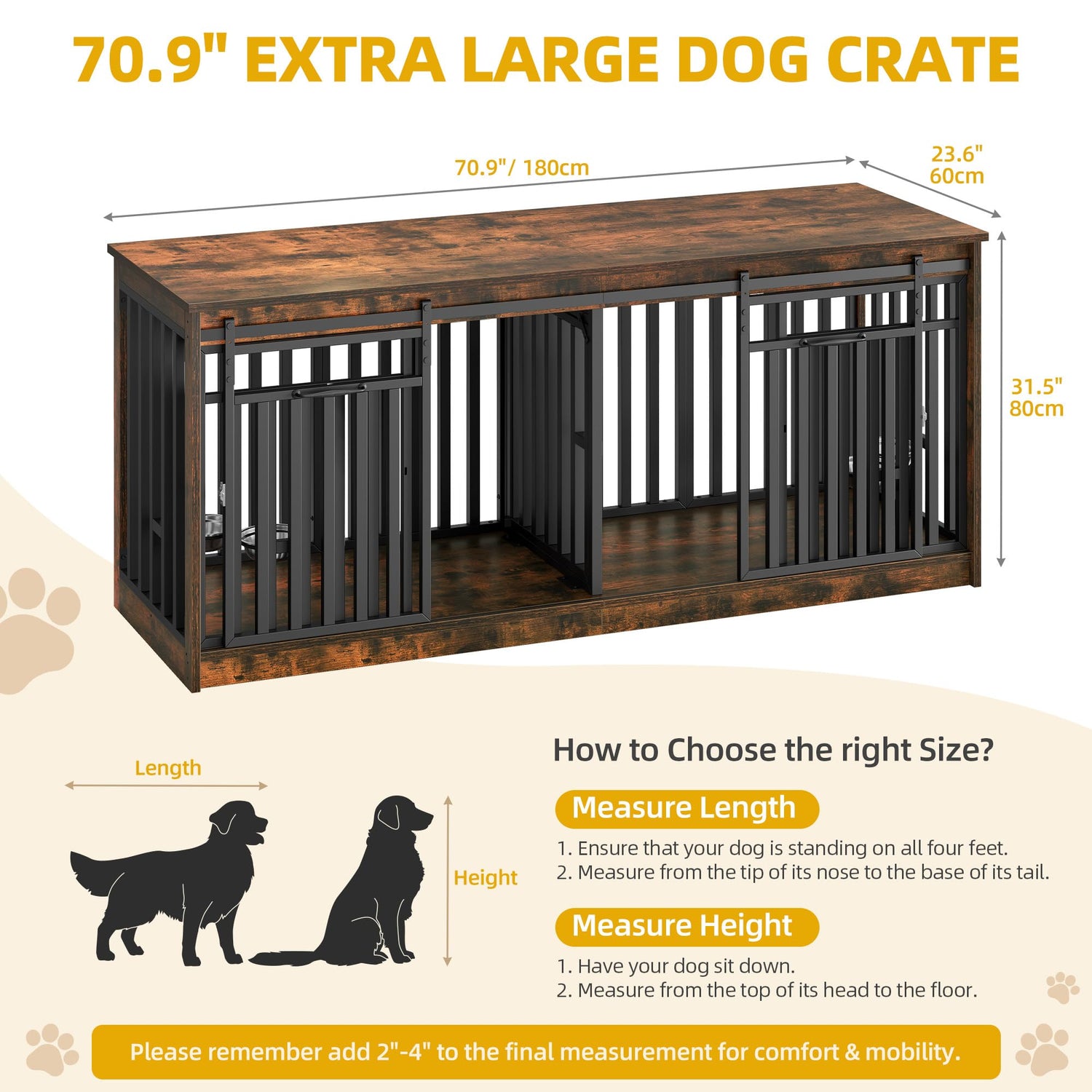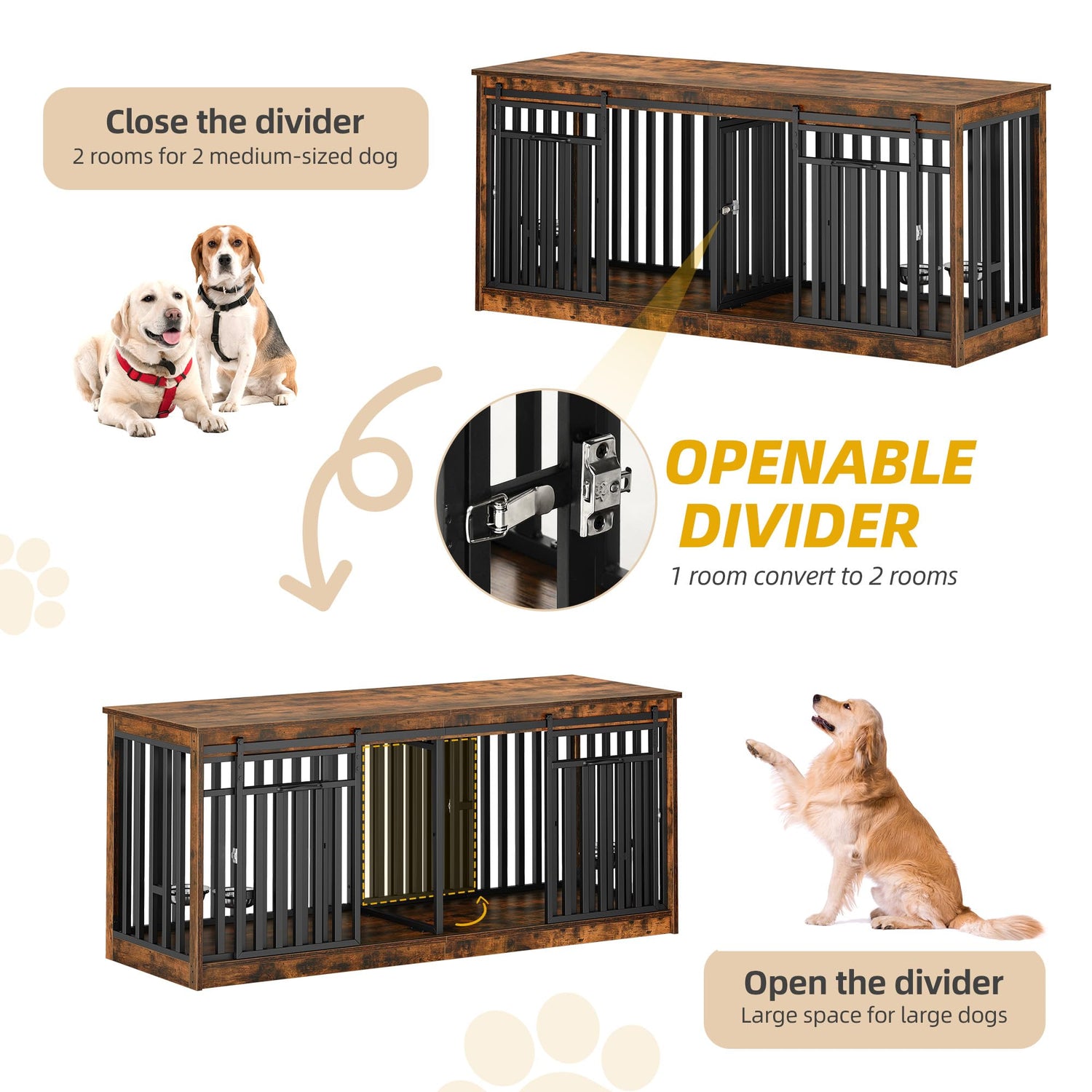 - Stylish and Functional Design: This 71" double dog crate furniture features a heavy-duty wood construction with a rustic brown finish, serving as a dual dog kennel and TV stand. Its sliding doors and decorative wooden structure add a touch of elegance to any room