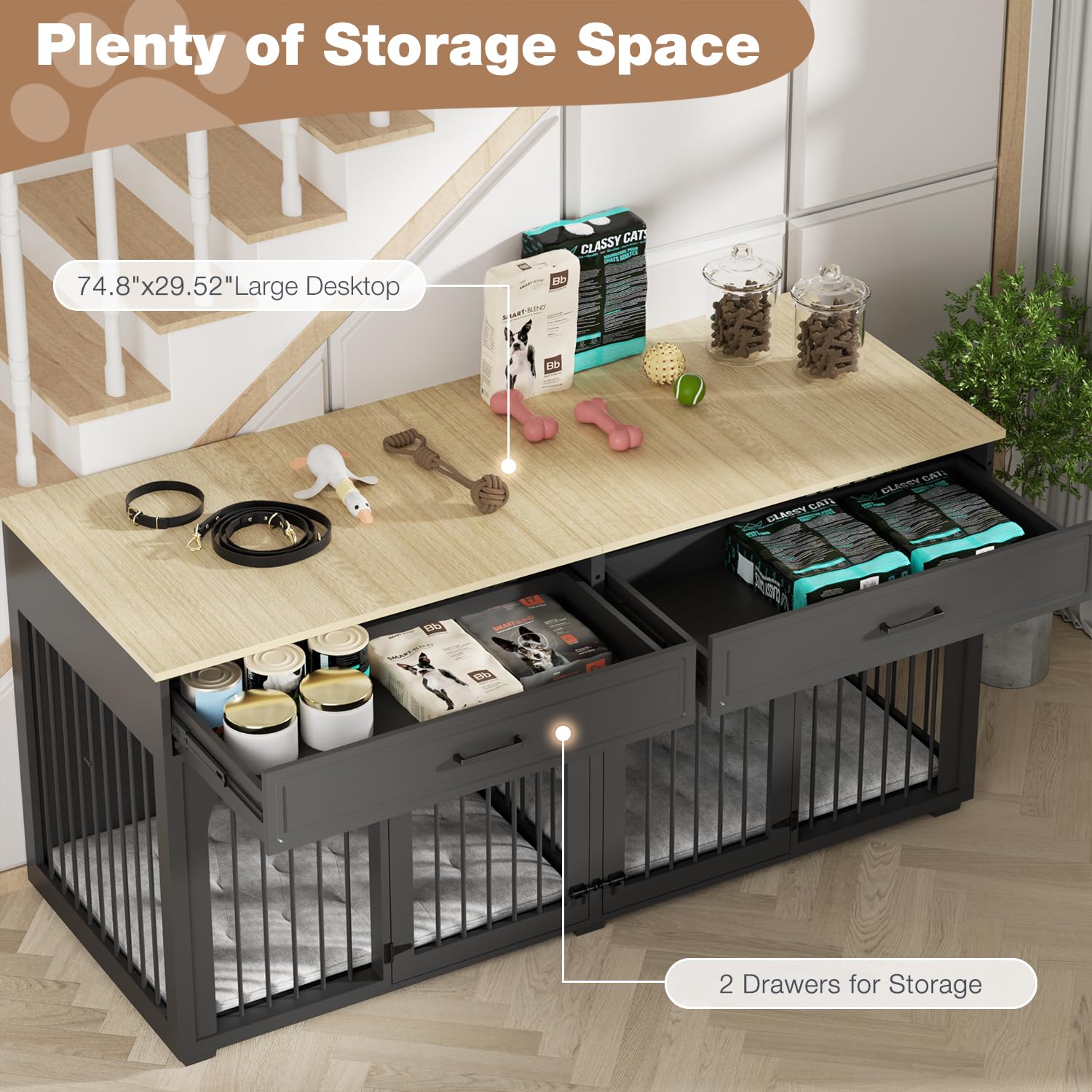 EBE 74.8'' Dog Crate Furniture, Wooden Dog Crate with 2 Drawers and Removable Divider, Heavy Duty Dog Kennel Indoor TV Stand for Small Large Medium Dogs, Black