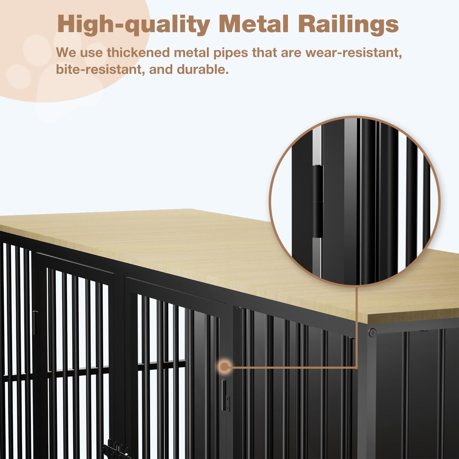 - 【METAL DOUBLE DOG CRATE】This large double dog crate is made of high-grade engineered wood and thickened metal frame, which is more chew-resistant than ordinary wooden dog crates. The heavy-duty metal fence door is sturdy and scratch-resistant, allowing you to interact with your pet in real time. Our dog kennel furniture can definitely give your furry friend the warmest home.