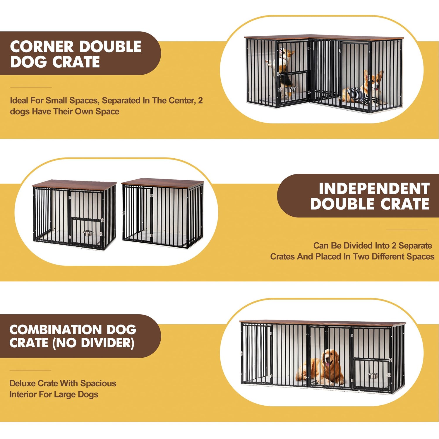 - 【Different Combinations】 This dog cage furniture has two separate rooms, easily accommodate two medium or large dogs. You can switch between one dog cage, two dog cages, and L-shaped dog cages by assembly and disassembly. Removable dividers allow each dog to enjoy their own space in the crate. Perfect for multi-pet families to make the most of the space in your home