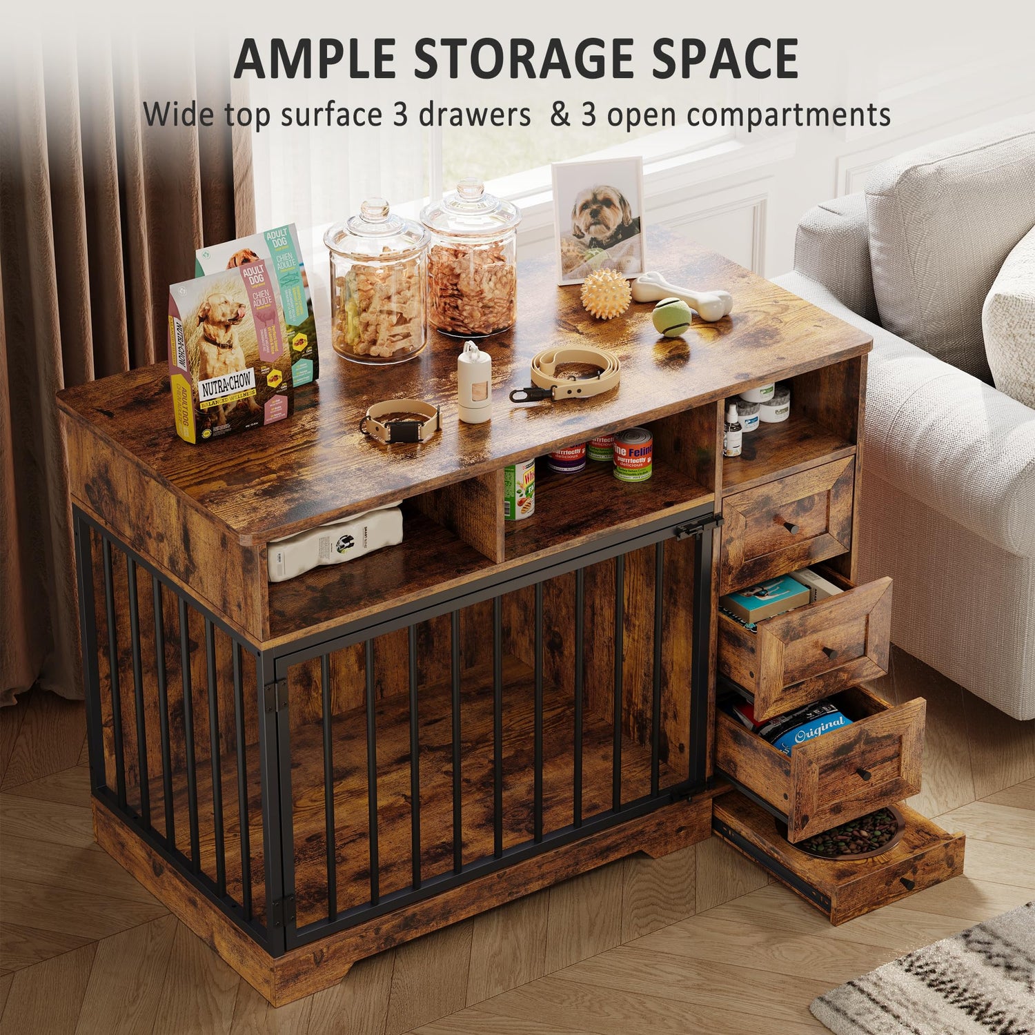 - Organized Living:This modern dog crate features a generous tabletop for displaying decor or essentials, plus three open drawers and three concealed drawers. Keep your pet's toys, leashes, and accessories organized while maintaining a tidy living area