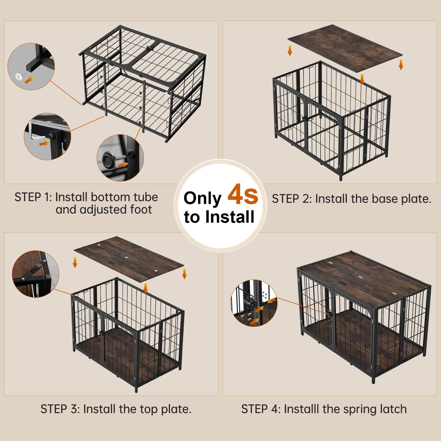 - 【4 steps to install】 The iron frame of the dog crate can be folded. Only takes 4 steps,open the iron frame, assemble the two boards on it and install the lock of dog cage. No complicated tools are required, saving your time.