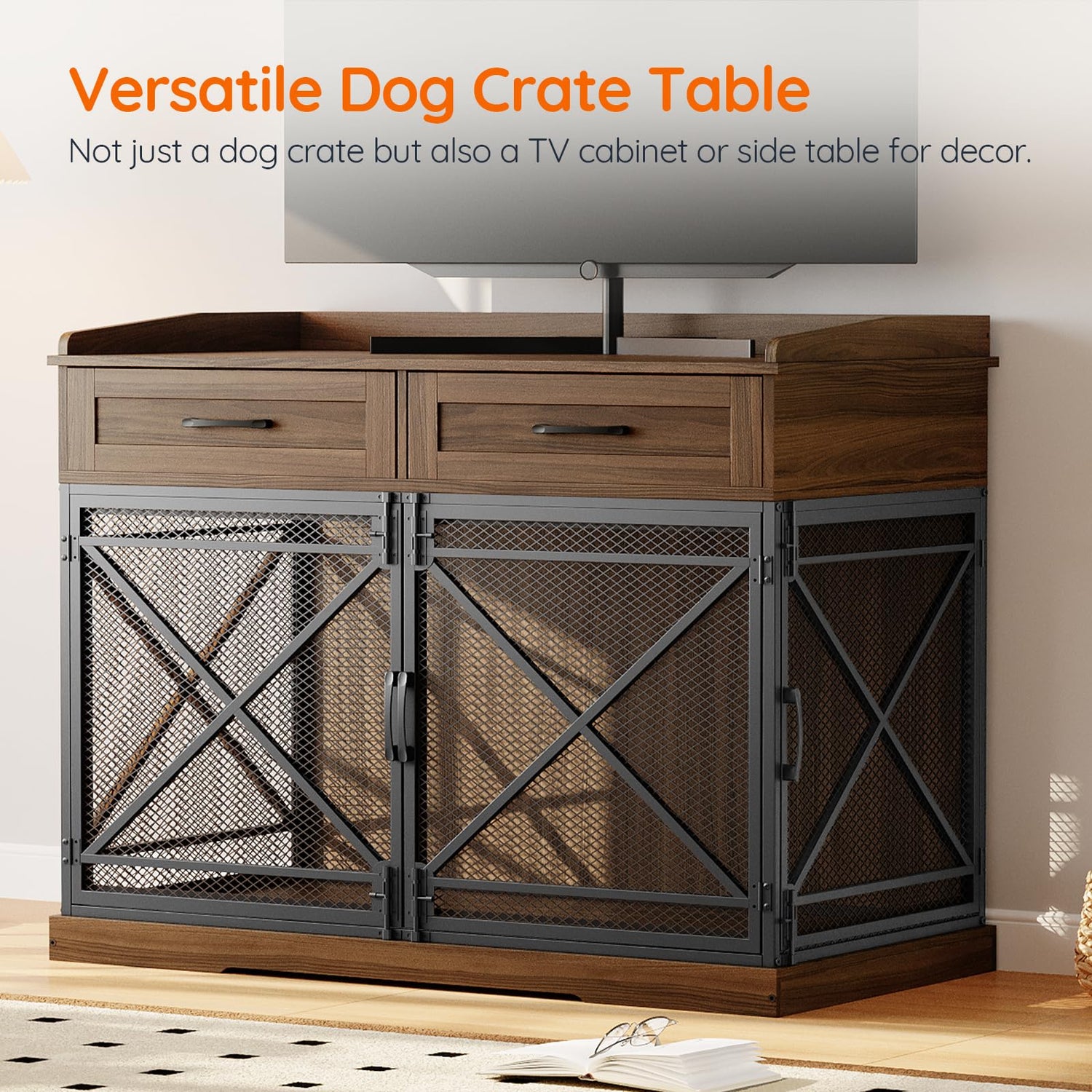 HOOBRO 43.3” Dog Crate Furniture, XL Heavy Duty Dog Kennel with Drawers, Wooden Crate Indoor Side End Table for Medium to Large Dogs, Triple Door Design, Walnut and Black