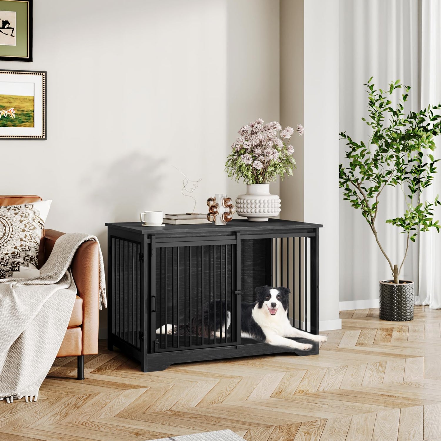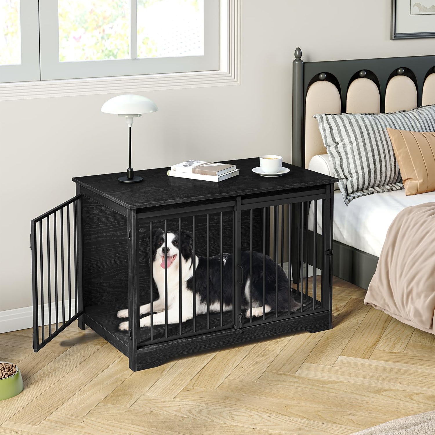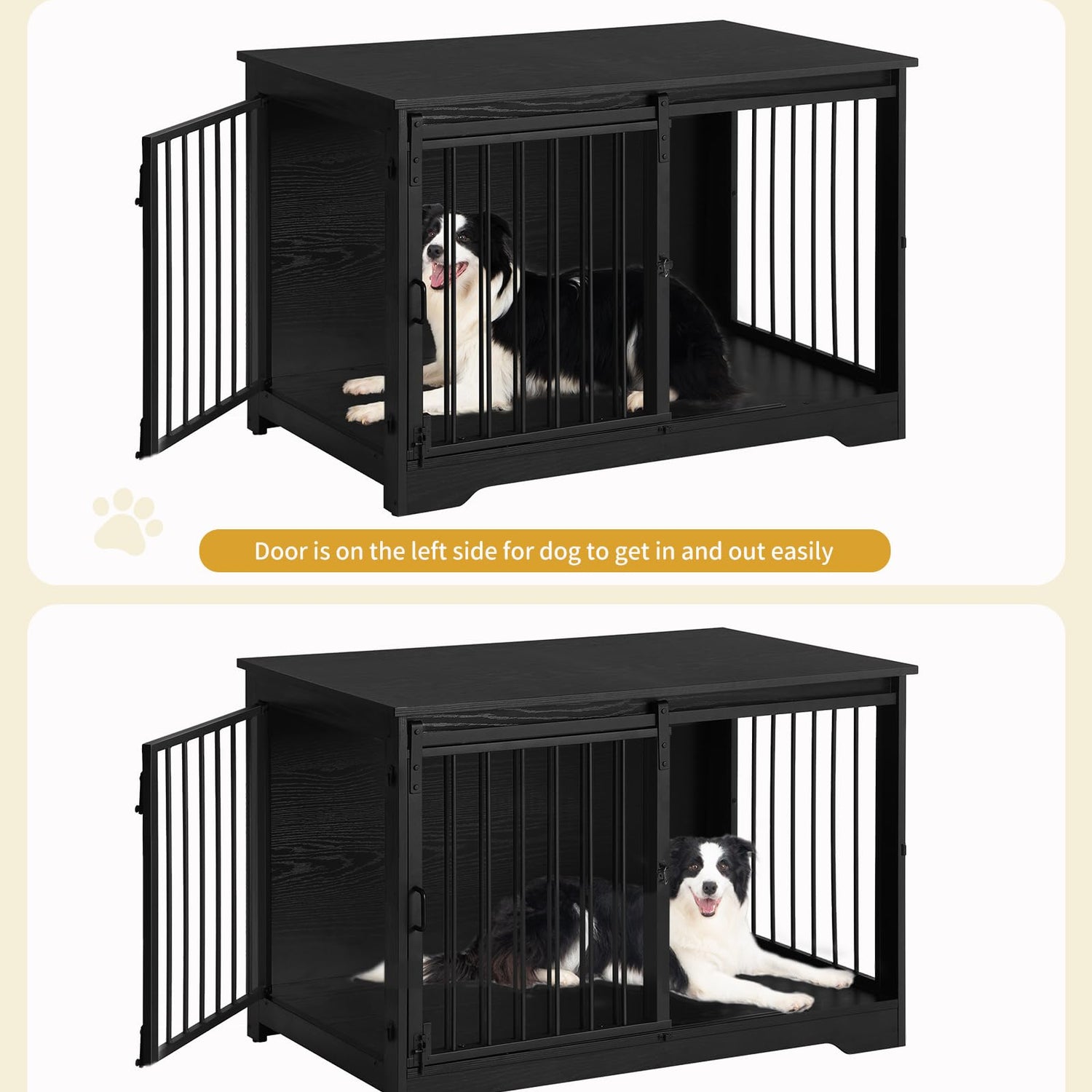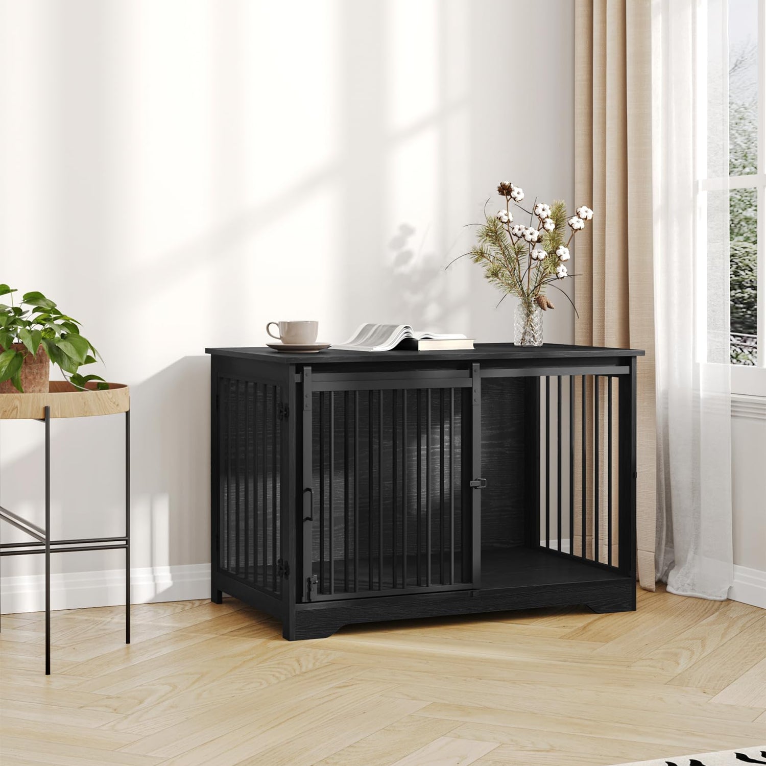 Hzuaneri 39.3" Dog Crate Furniture with Barn Door, Heavy Duty Dog Kennel Indoor with 2 Doors, Wooden Pet Cage End Table for Large Small Medium Dogs, Anti-Chew Anti-Escape, Black DFC02304B