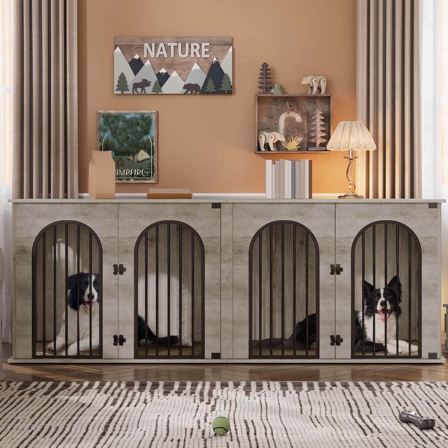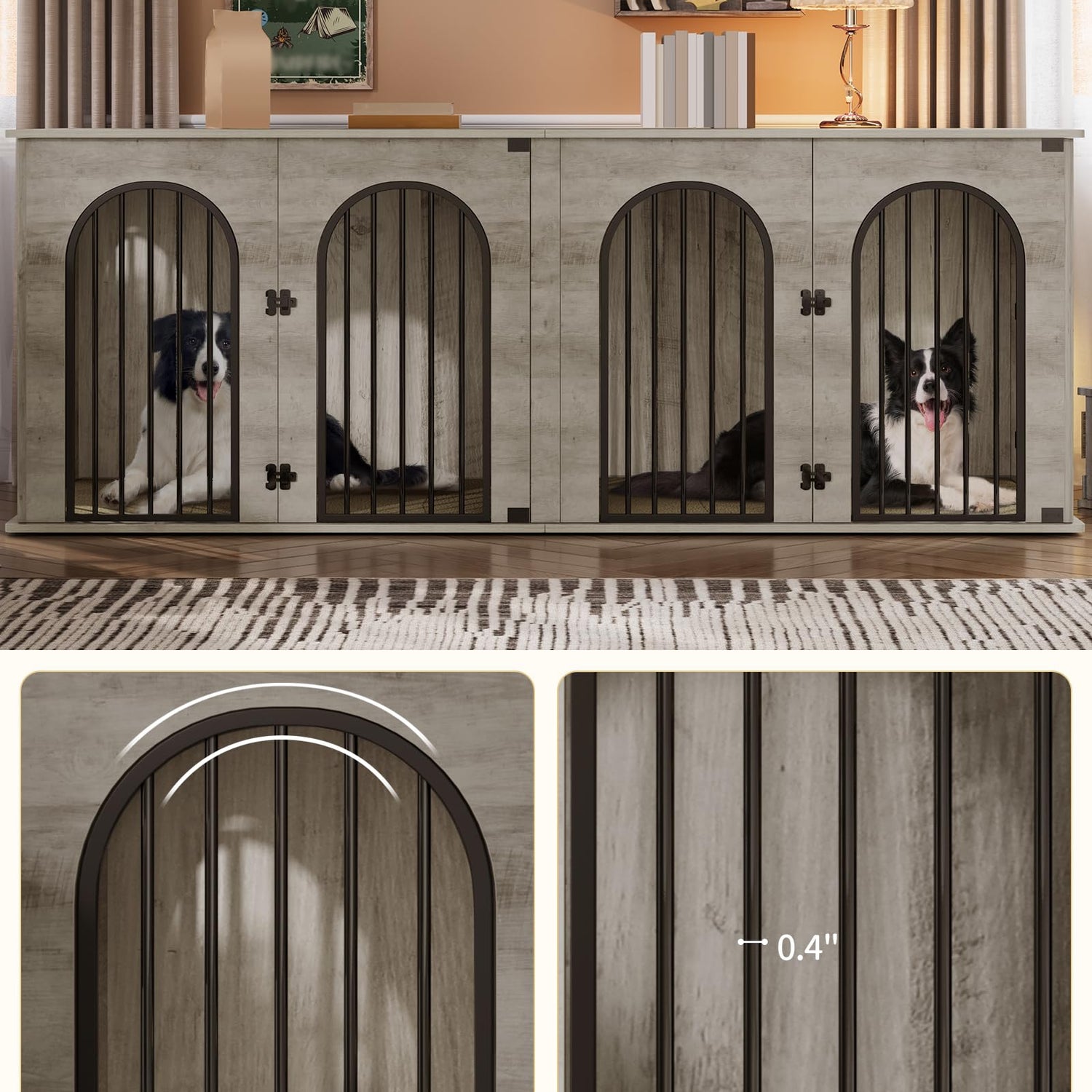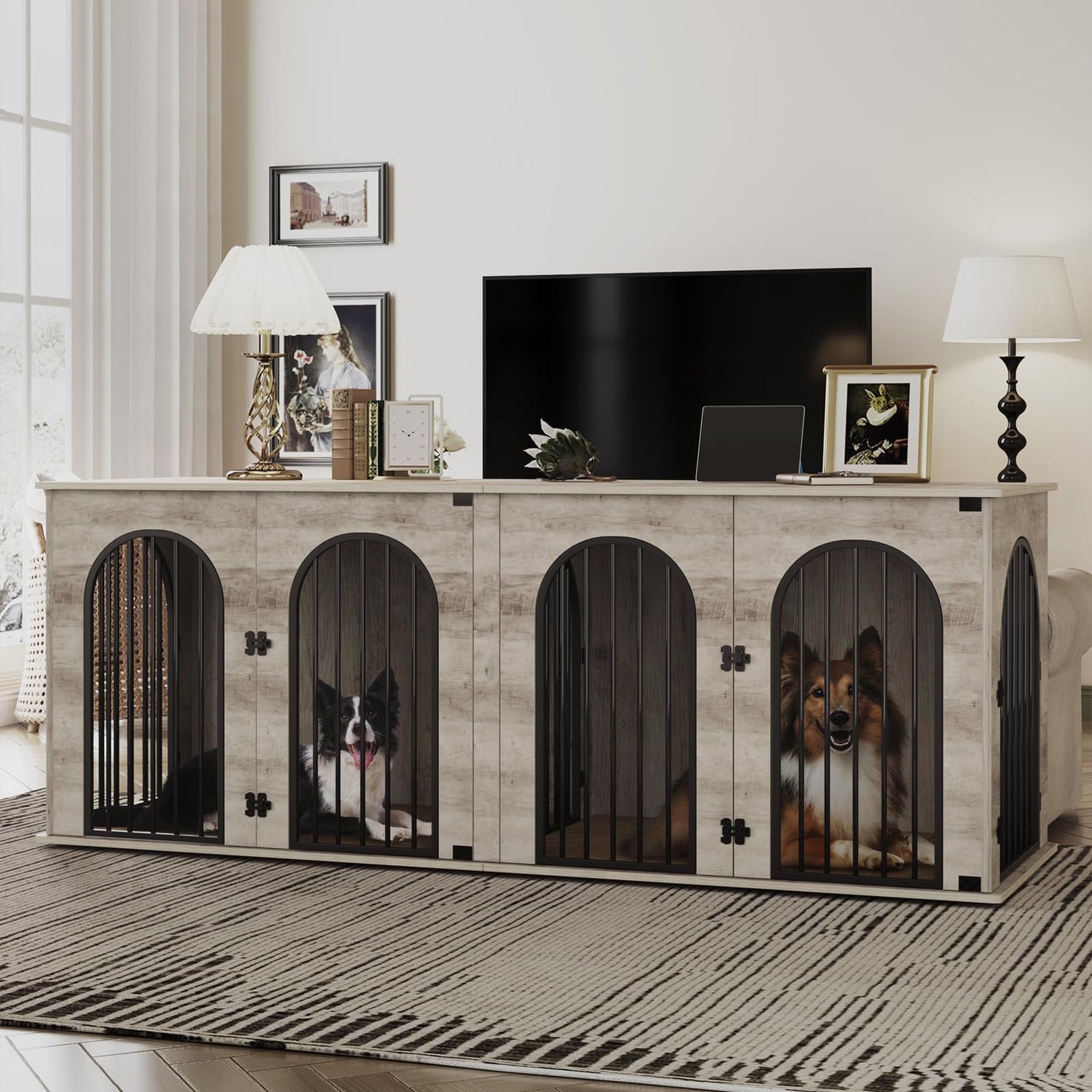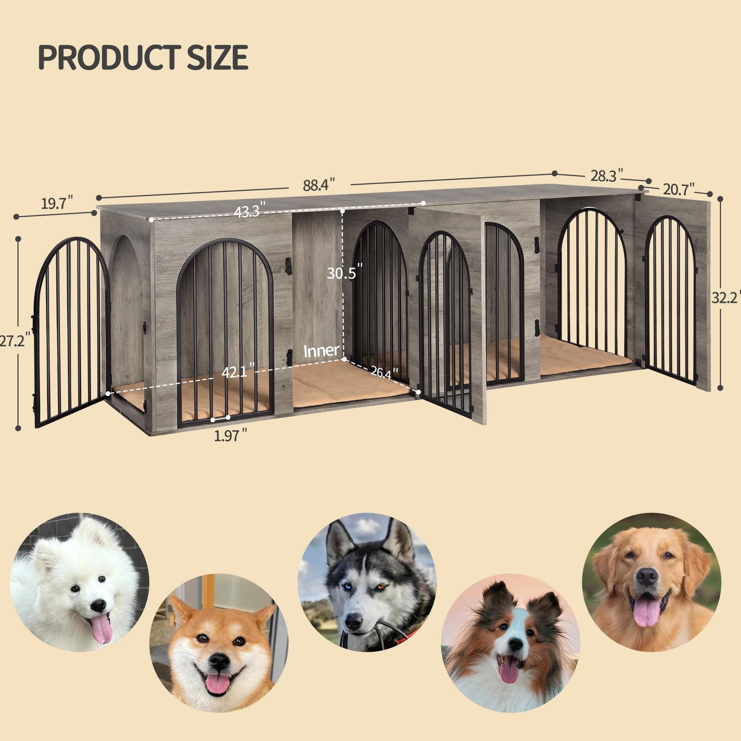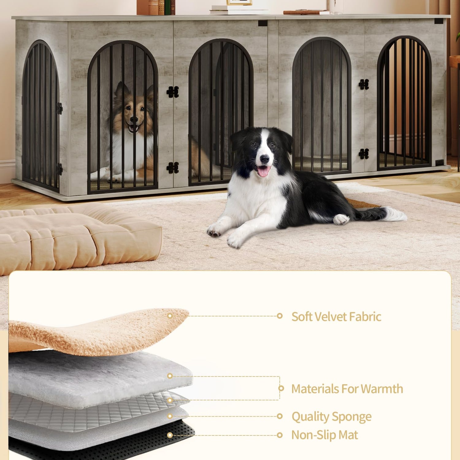Hzuaneri 88.4" Dog Crate Furniture for 2 Dogs, Heavy Duty Indoor Dog Kennel TV Stand, XXL Wooden Dog Cage with Divider for Medium Large Dogs, End Table Dog Crate with Cushion, Greige Black DFC84005BV1