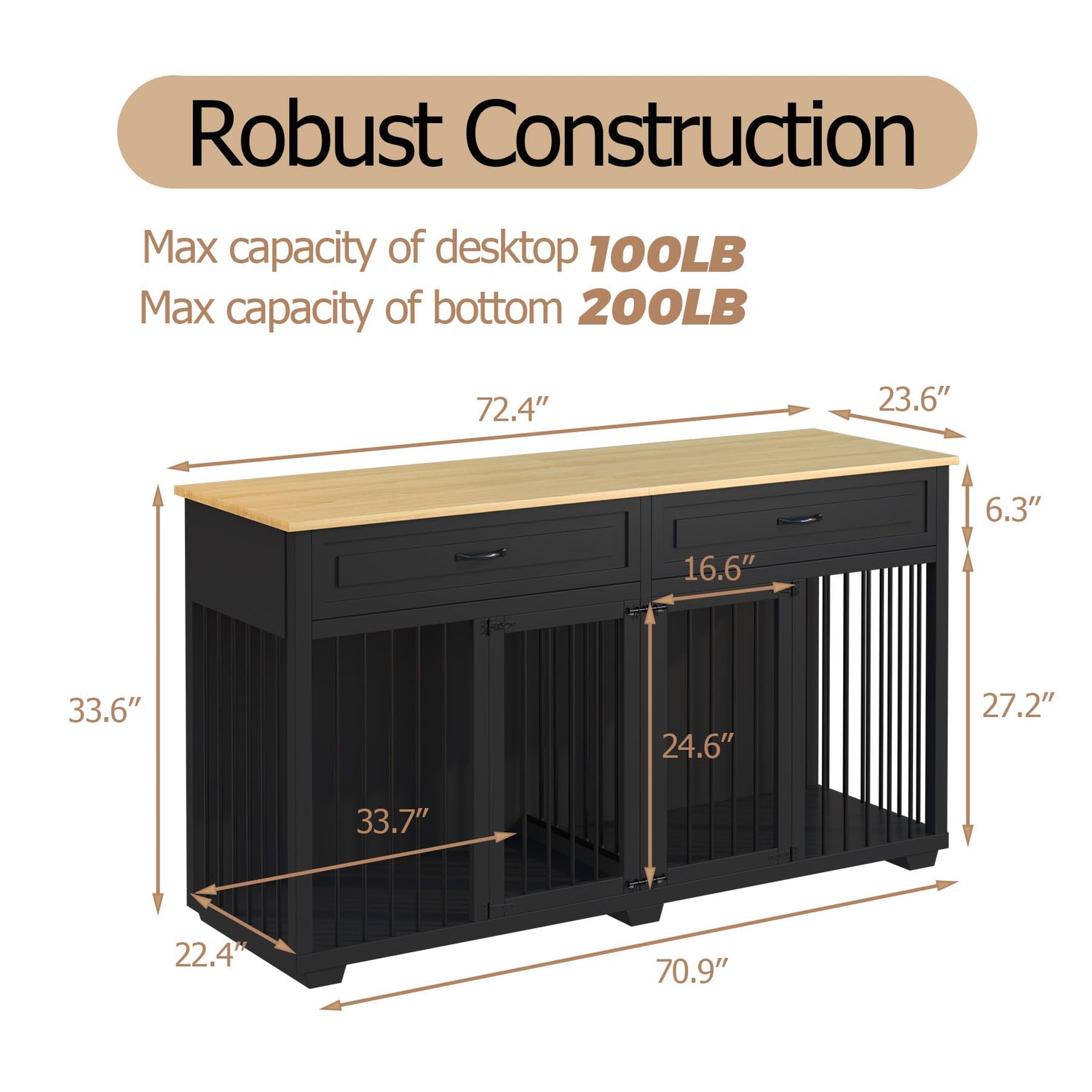 Lovinouse Furniture Style Dog Crate with Double Room, 73 Inch Wooden Dog Kennel with Removable Divider, Dog House TV Entertaiment Center for Small Medium Large X-Large Dogs (Black with Drawer)