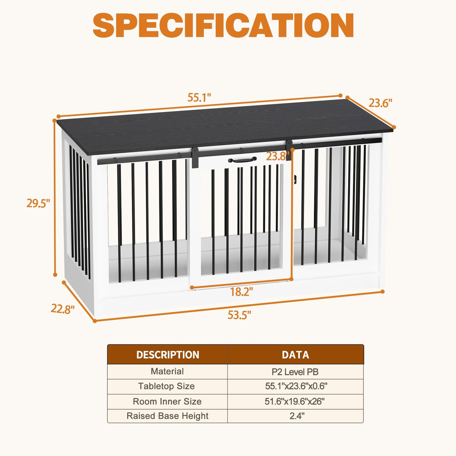 PIAOMTIEE 55 Inch Furniture Style Dog Crate for Large Medium Breed Dogs, Indoor Heavy Duty Dog Kennel House with Sliding Doors, Rustic Dog Crate Furniture Side End Table TV Stand, White