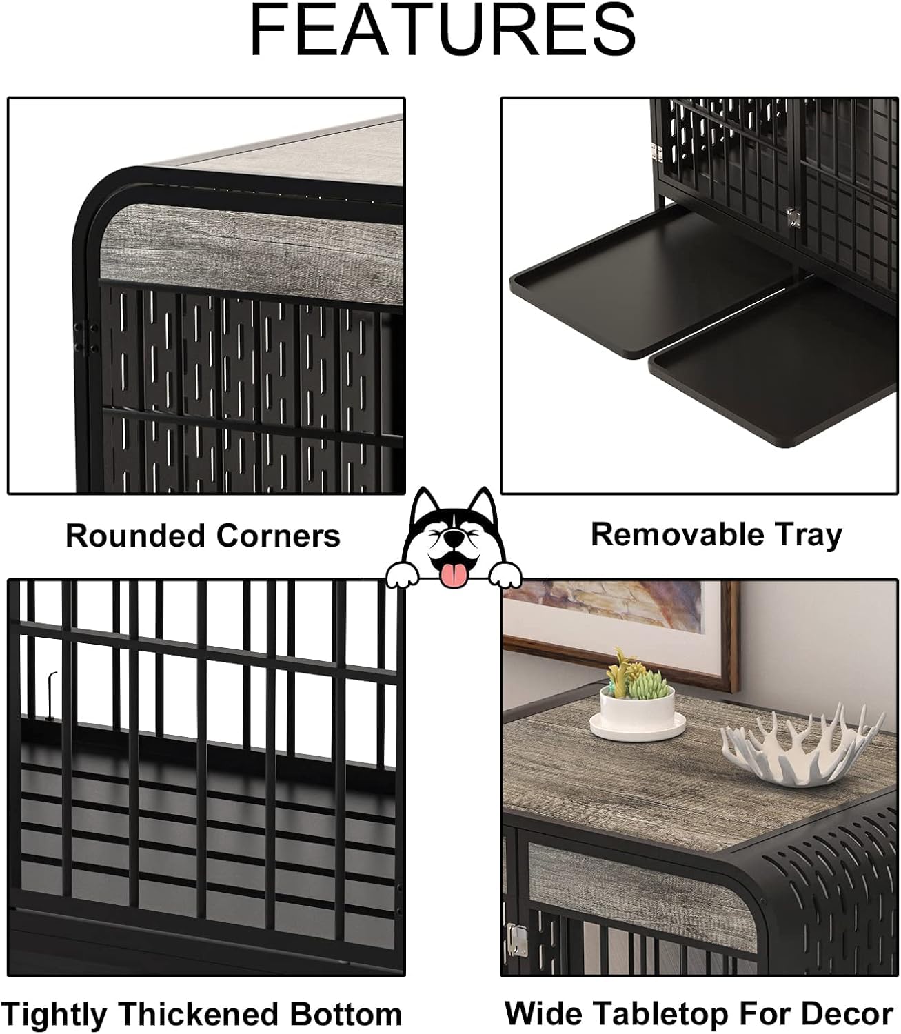 - [EASY TO ASSEMBLE AND CLEAN]: All parts are included with clearly instruction, you can easily assemble this dog crate step by step. The material of the crate and tray is easy to clean, flushing water or a damp cloth is enough. Any questions, please feel free to contact us and we will provide you an acceptable solution within 24 hrs.