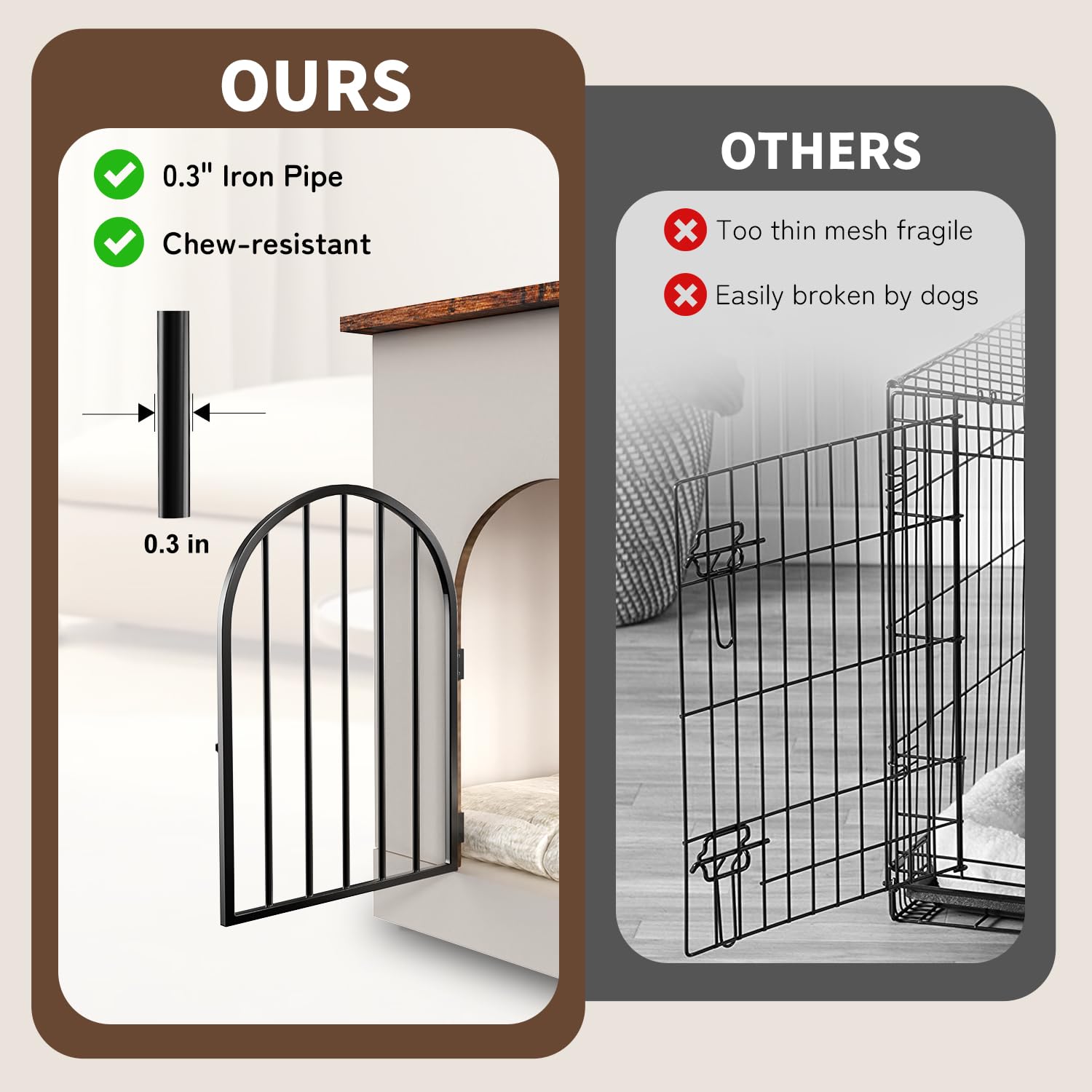 - STURDY AND CHEW-RESISTANT: This heavy duty dog cage is crafted from green P2-compliant marterial,thick 15mm particleborad and 0.3" steel tubes. The robust wood-iron structure enhances chew resistance, providing comfort, durability, and easy to clean.