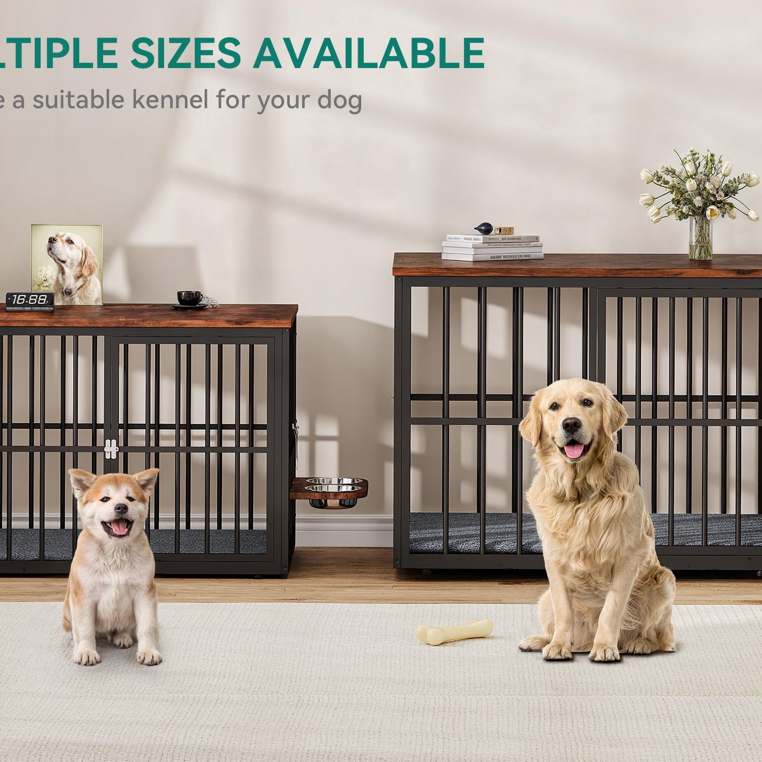 - 【Sturdy and Durable】This double dog crate is equipped with dual -door and dual lock design, made of high-quality P2-grade MDF board and Made of 0.8" thick steel pipe, the solid steel pipe structure and anti-bite structural design ensure pet-safe durability and long service life. Compared with traditional iron dog cages, it is more comfortable and durable.