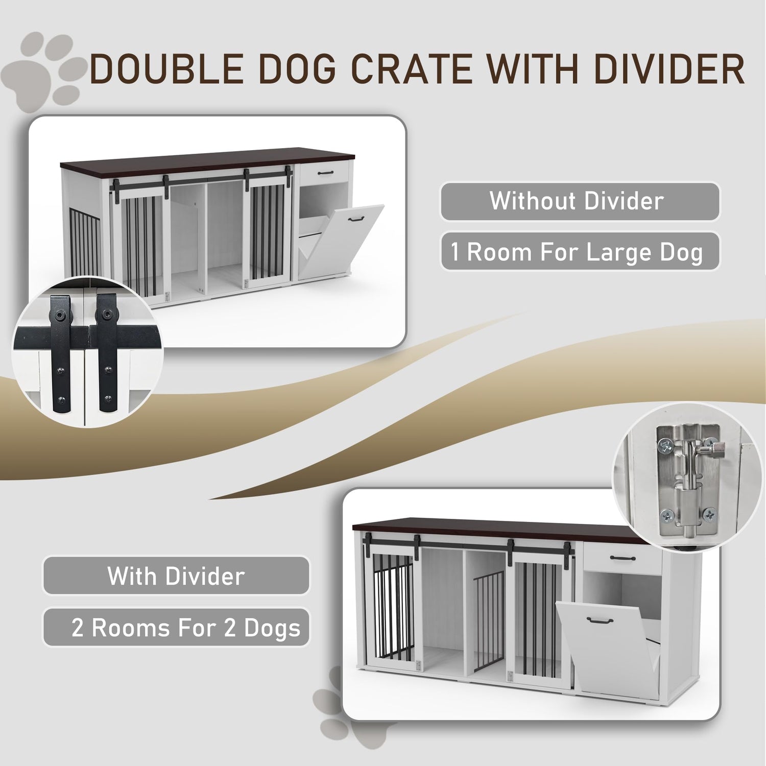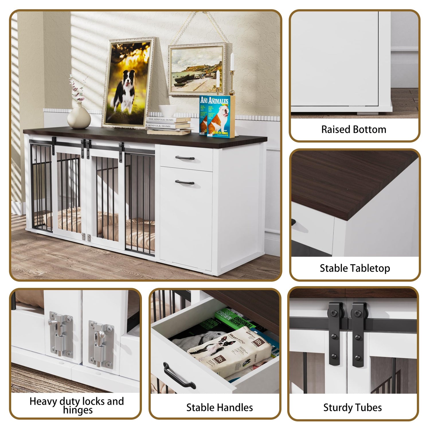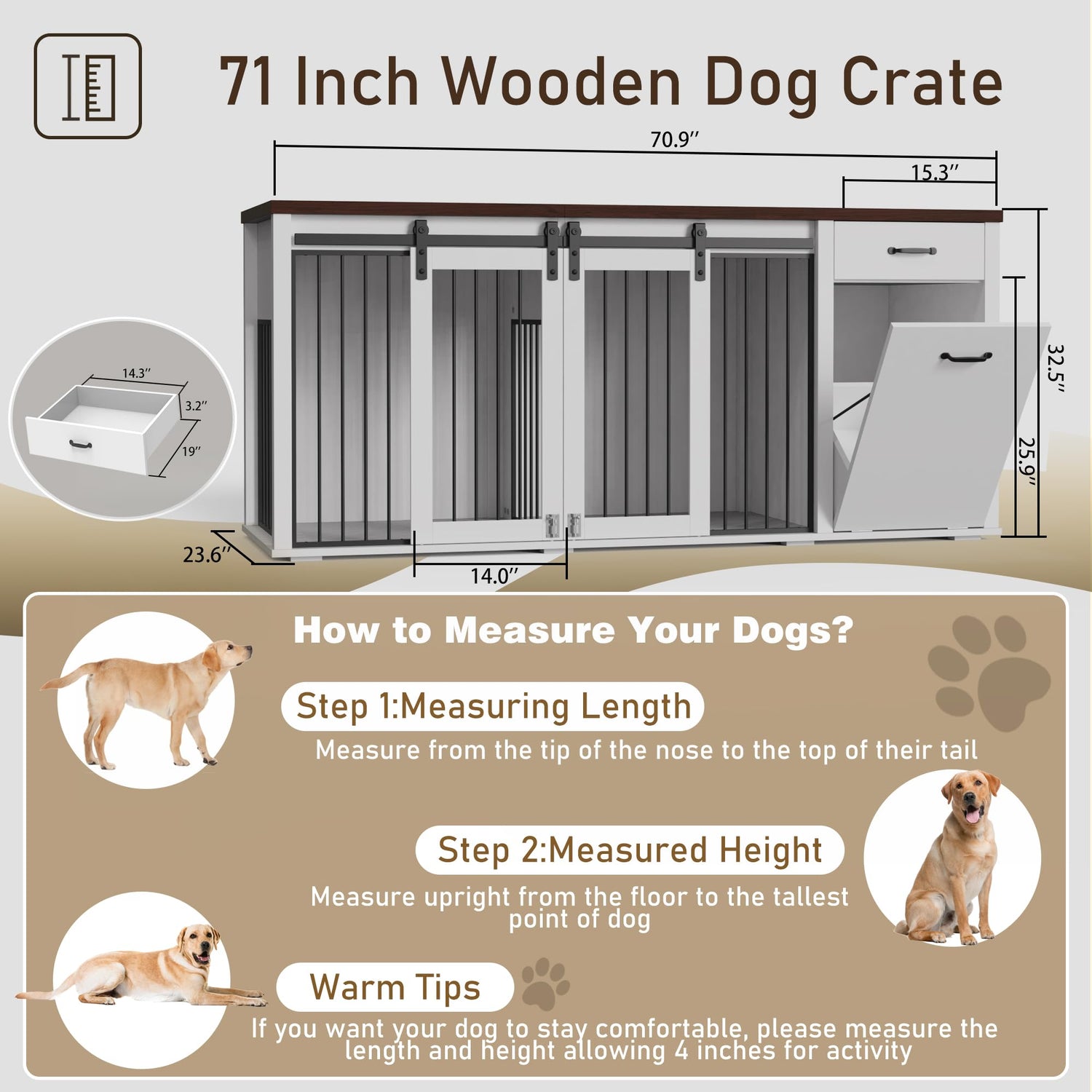 YOCONYO Large Dog Crate Furniture Large Breed,71 Inch Wooden Dog Crate with Tilt Out Trash Cabinet,Drawers,Divider and Sliding Barn Door, Double Doors Dogs Crate for 2 Dogs (White)