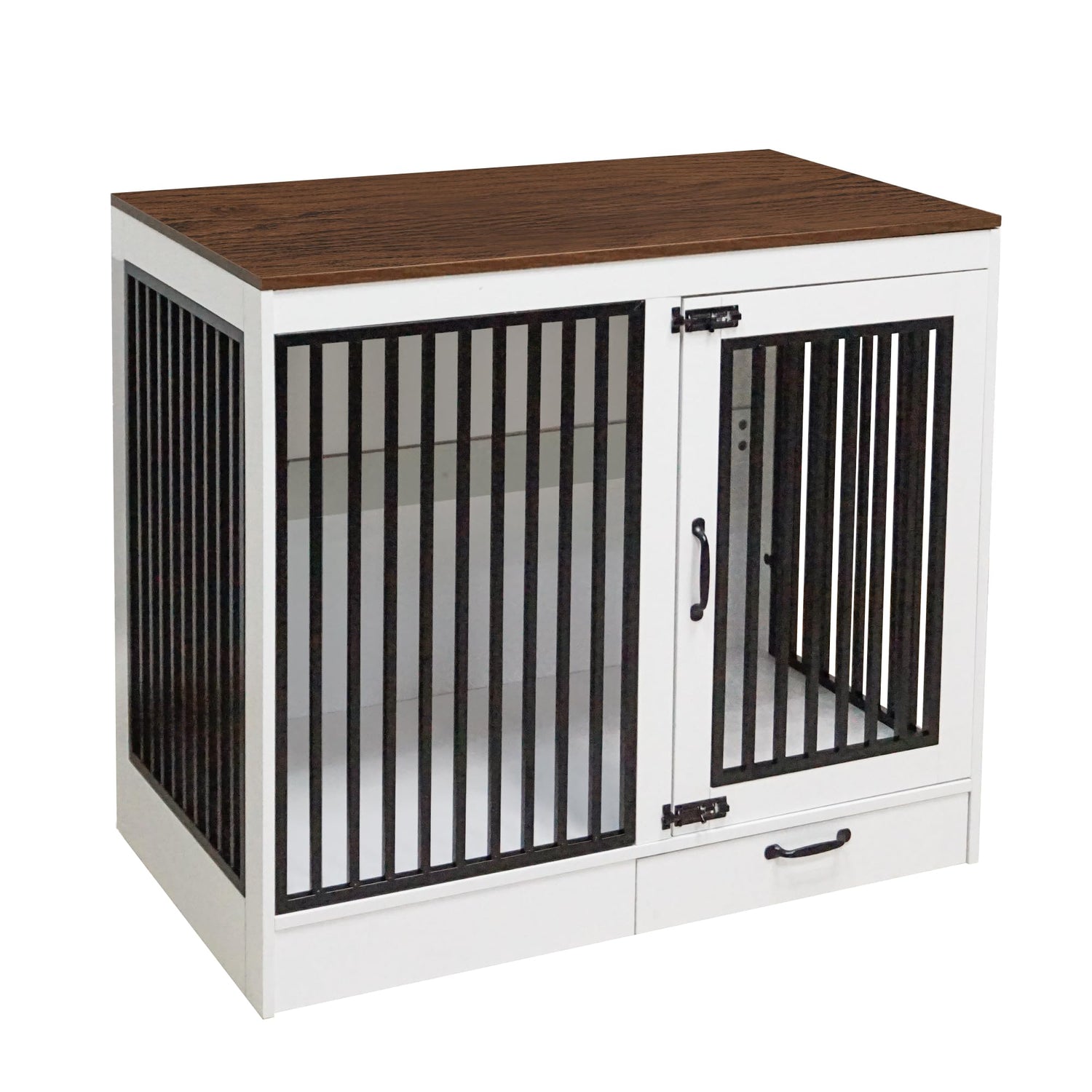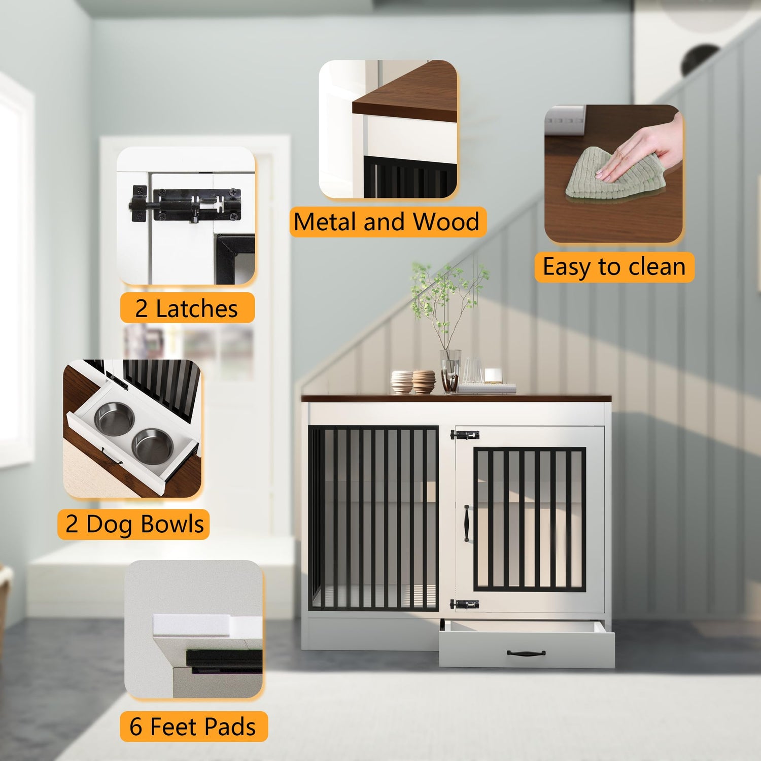 yookare White Heavy Duty Furniture Dog Crate, Wood and Metal Kennel Cage, Pet House End Table with Drawer and Pull-Out Design, Dog Home for Indoor use, Large Size
