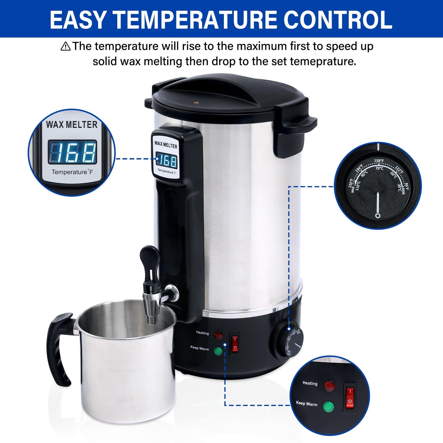 - Easy and Safe: Our wax melter is made of high-quality stainless steel with double-layer design to effectively maintain the temperature and anti-scald. Simply put the wax into the melter and set the temperature.
