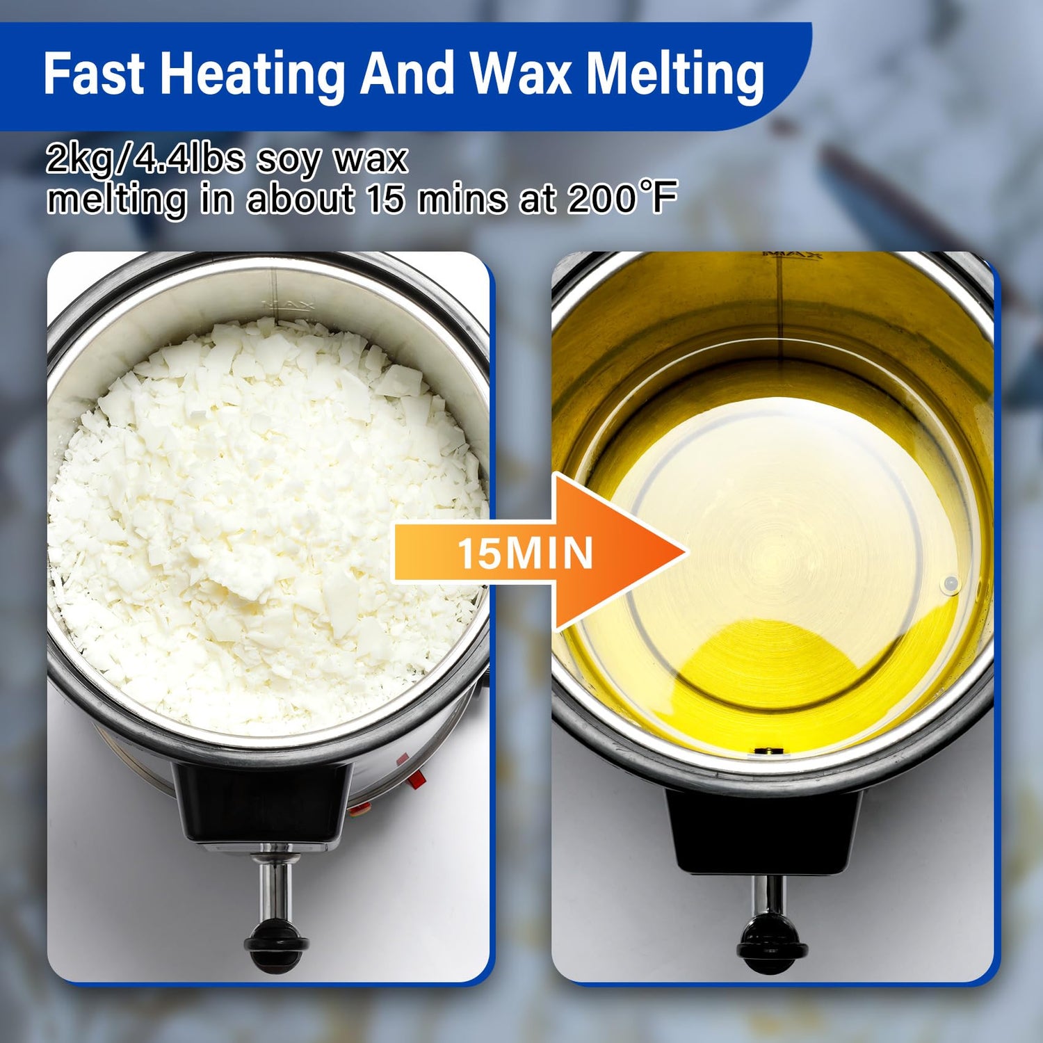 - Fast Heating and Wax Melting: 1100W candle wax melter pot melts 4.4 lbs soy wax in 15 mins at 200℉. The temperature will rise to its maximum, then drop to the set temperature. Due to residual heat, there may be a +/-5°C temperature difference, ensuring your wax is melted perfectly.