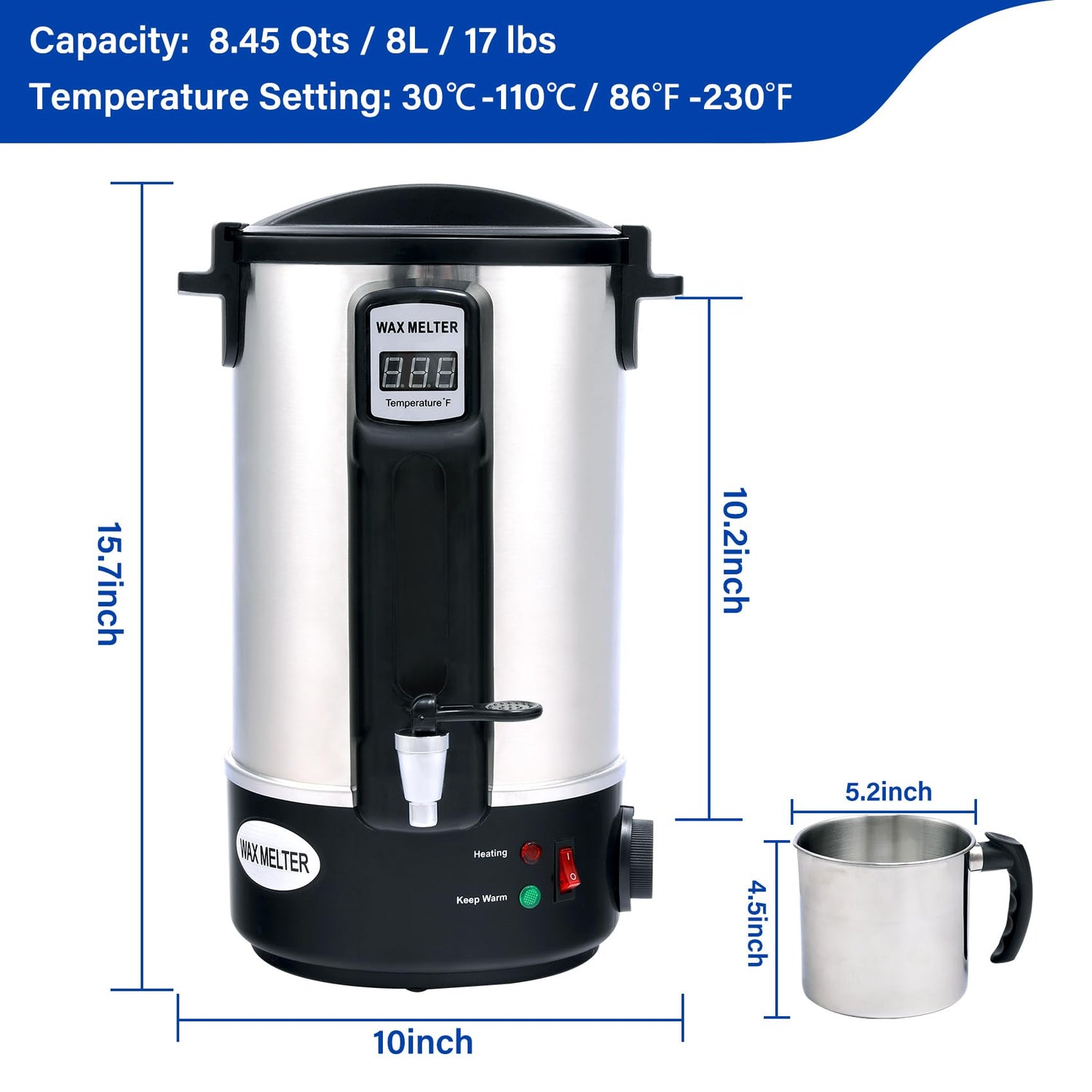- 8.45 Quart Candle Wax Melter: TCFUNDY wax melting pot has large capacity of 8 L, holds up to 17 lbs soy wax, allows you for batch candle making. The wax melter pot can melt different types of wax, such as soy wax, beeswax, paraffin, coconut wax, jelly wax, etc.