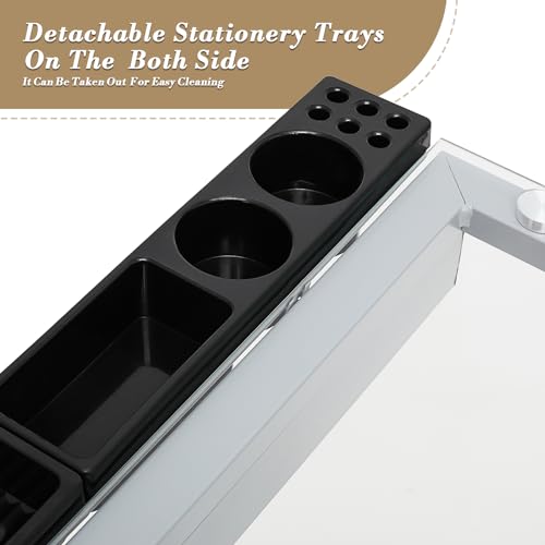 • Removable Plastic Trays: 4 embedded stationery trays on both sides can be freely arranged, several honeycomb pen holes and slots in different sizes on the trays help organize stationery and tools. Two non-woven fabric drawers on the right can be pulled out silently.