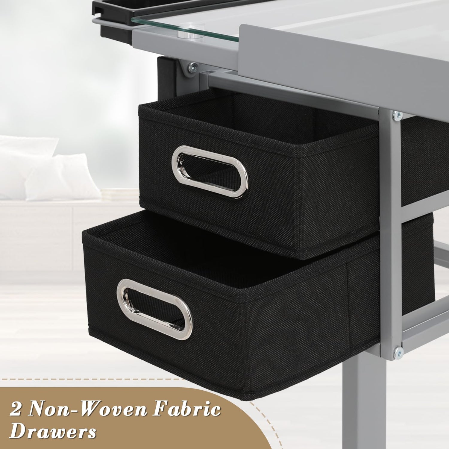 Athena Collection 41" Drafting Table Adjustable Angle Drawing Table Tempered Glass Art Desk Metal Frame Craft Desk Artist Desk with Fabric Drawers, Rolling Casters and Trays, Light Grey