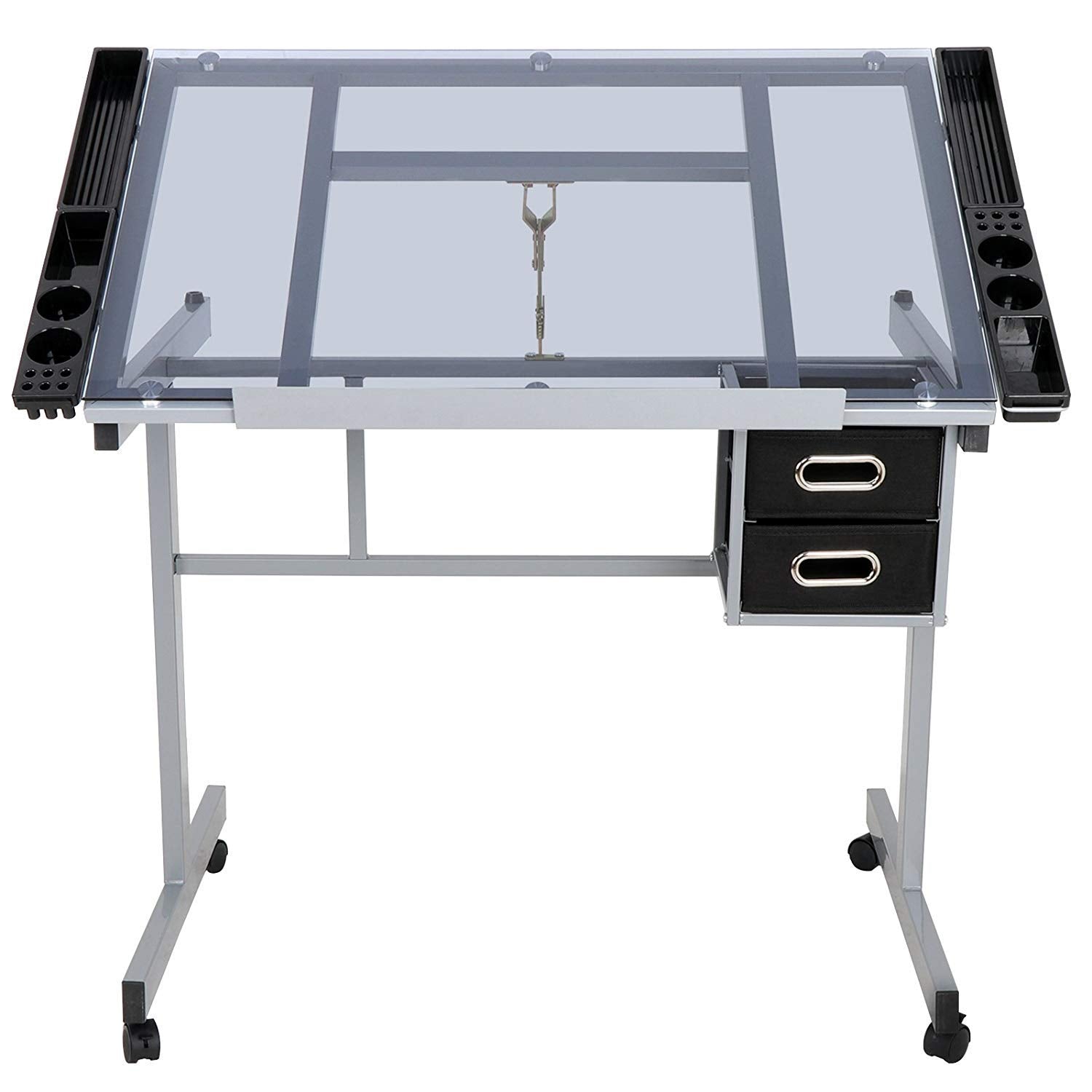 BBBuy Adjustable Drafting Table Drawing Desk Art Craft Station Drafting Desk Glass Tabletop w/2 Slide Drawers and Wheels for Drawing, Sketching, Reading, Painting Home Office