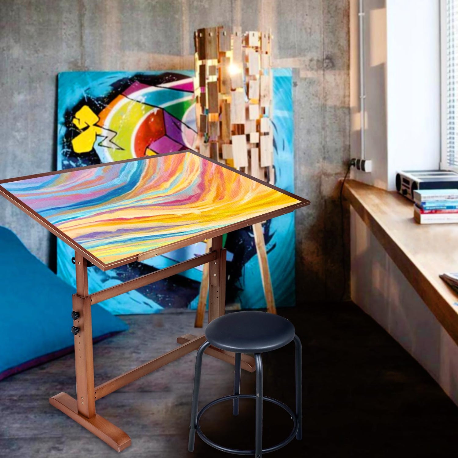 Falling in Art Wooden Drafting Table and Stool Set, Walnut 30" x 42" Adjustable Height and Angle Solid Wood Drawing Desk for Adults, Artist Craft Table for Painting Artwork, Reading, and Writing