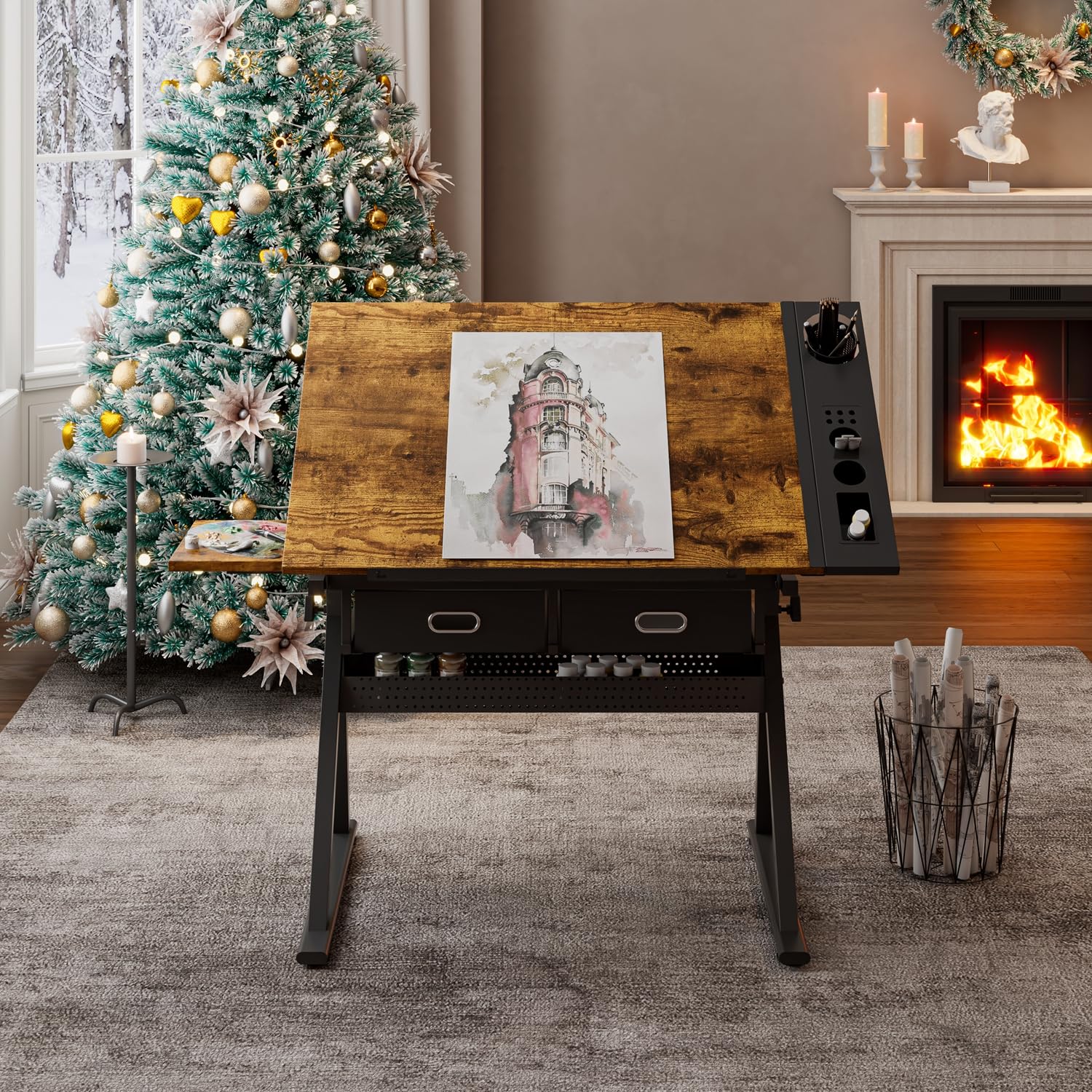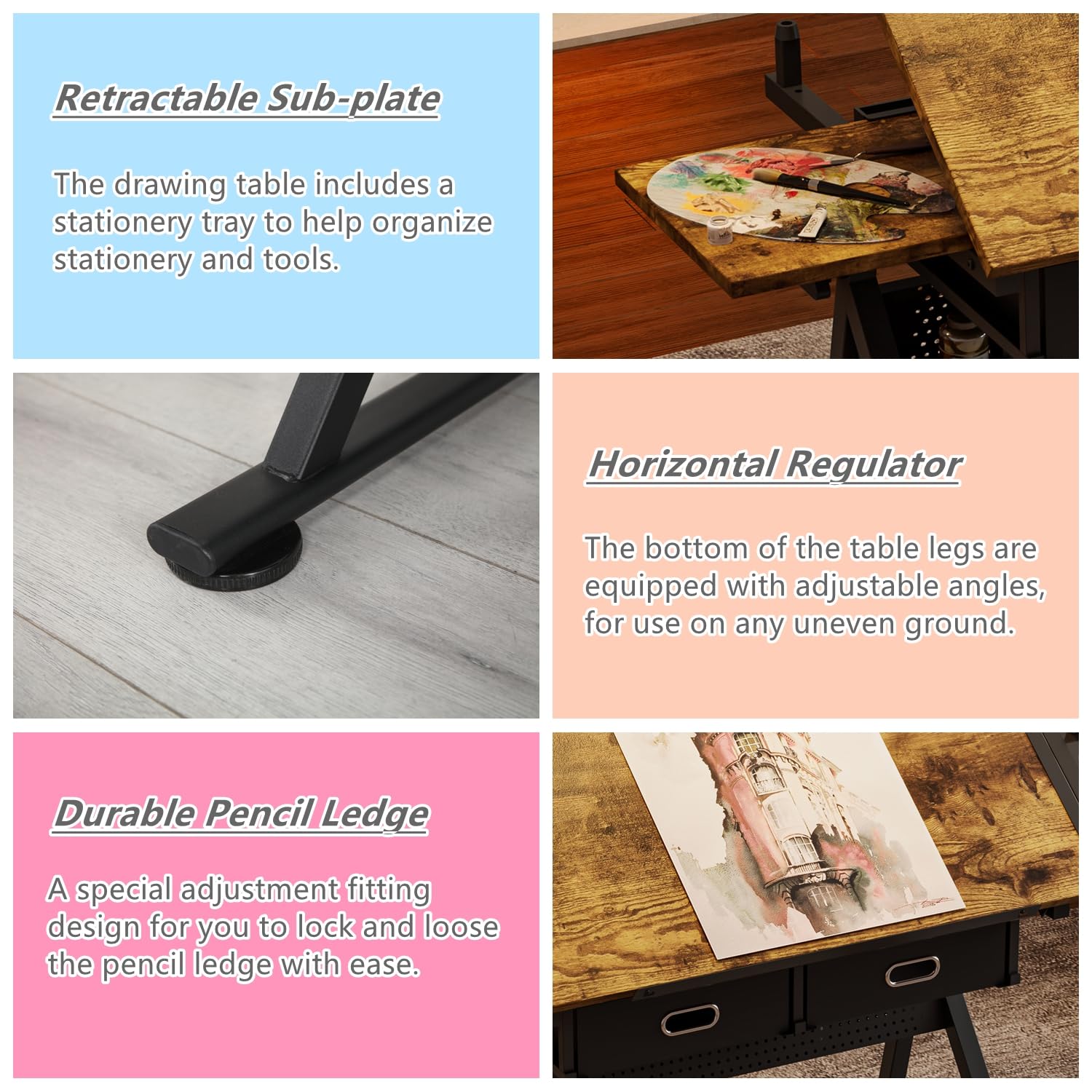 - Adjustable Desk Surface to Meet Diverse Needs -- The height adjustable drawing table measures 49.6"L x 23.6"W x (26.8-35.8)"H in overall dimensions. The big tabletop angle can be adjusted between 0 and 75 degrees, making it easy to handle different types of painting, such as sketching, watercolor, and oil painting. This design greatly enhances the practicality and flexibility of the drawing desk.