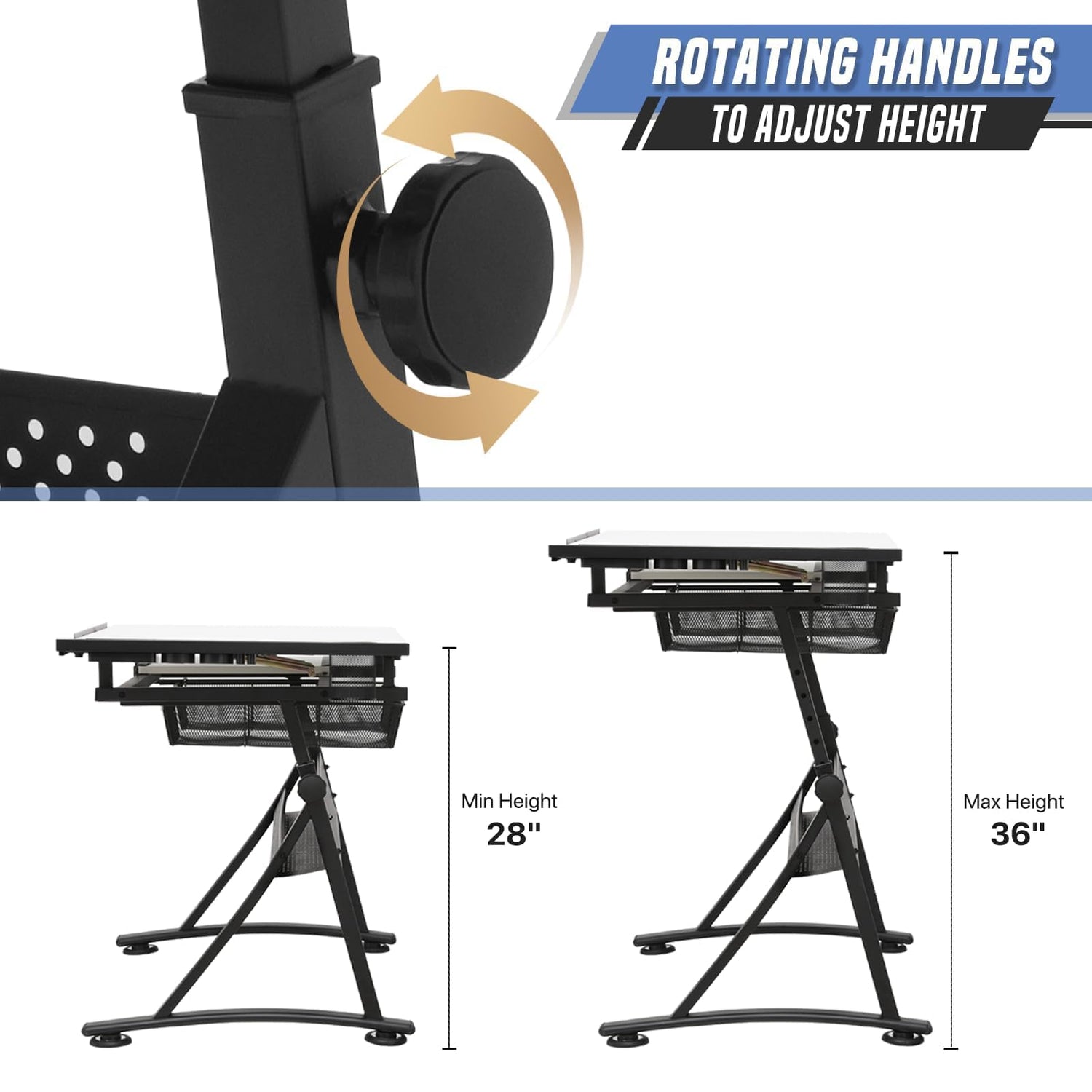 - Adjustable Height and Angles - The drafting table height can be adjusted from 28 to 36 inches, and the angle can be adjusted from 0° to 69°, allowing you to find the perfect position for drawing, drafting, or crafting. This flexibility ensures that you can work comfortably and efficiently, no matter the project.